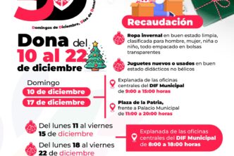 - Se instalarán módulos en la Explanada del DIF Municipal y frente a Palacio Municipal para recaudar juguetes y ropa invernal nuevos o en buen estado