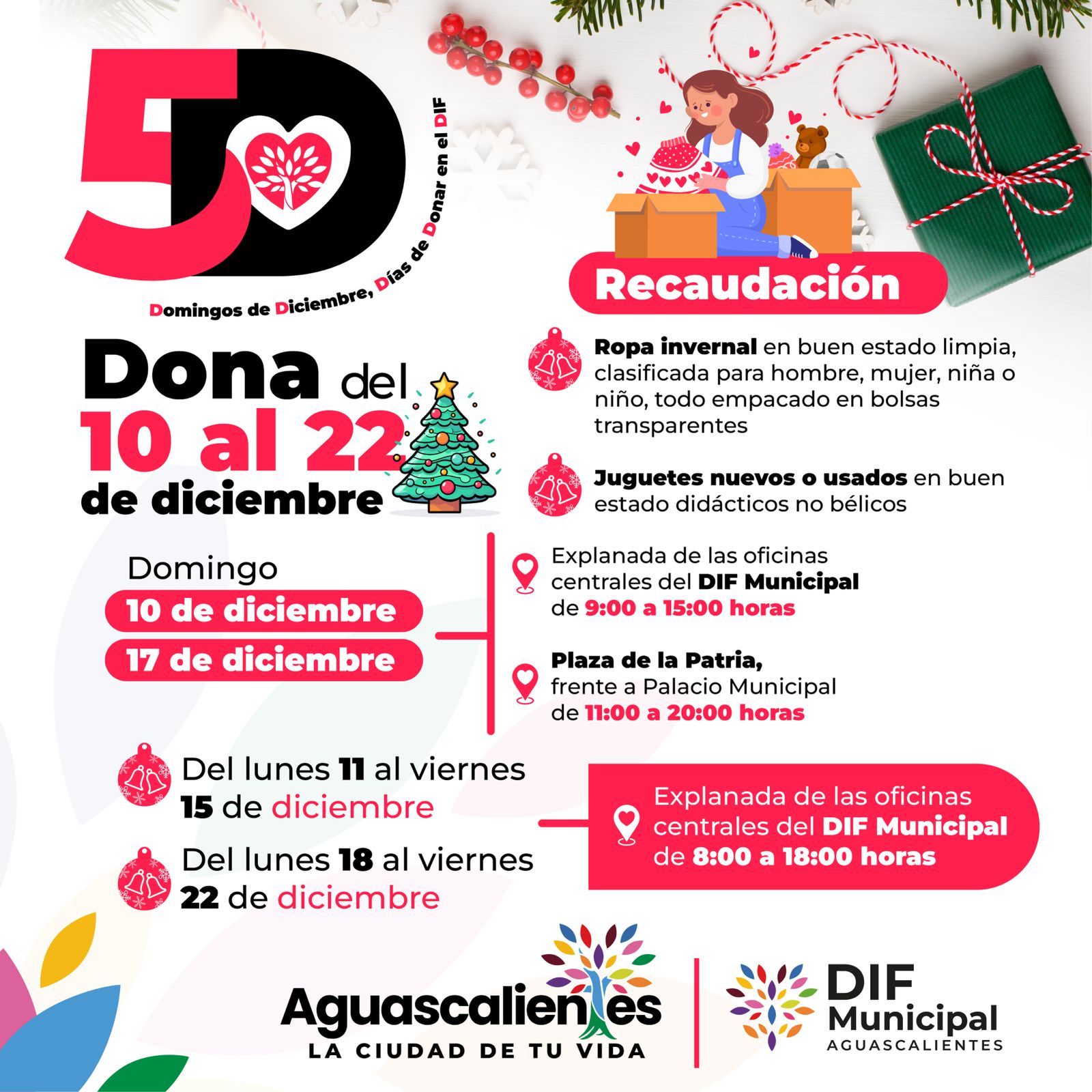 El Sistema para el Desarrollo Integral de la Familia (DIF) Municipal de Aguascalientes convoca a participar en la campaña de donación “Domingos de Diciembre, Días de Donar en el DIF”, para recabar ropa invernal y juguetes, que serán entregados a habitantes de las colonias y comunidades más vulnerables.