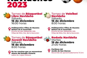 - Torneo de Voleibol Navideño, el cual se llevará a cabo el próximo sábado 16 de diciembre en punto de las 8:00 horas, en las instalaciones del Polideportivo Villas de Nuestra Señora de la Asunción (VNSA), ubicado en Av. Ermita de San Sebastián s/n esquina Poliducto, fraccionamiento VNSA, sector Guadalupe, donde participarán 4 equipos varoniles y 4 equipos femeniles