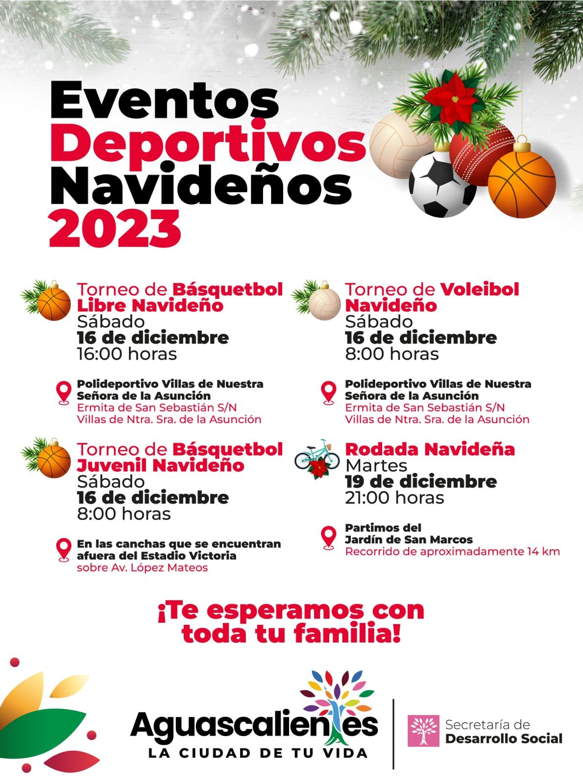 Con el objetivo de disfrutar de esta temporada decembrina, el Municipio de Aguascalientes a través de la Secretaria de Desarrollo Social (Sedesom) y la Dirección de Deportes, invitan a la población a disfrutar de torneos de basquetbol y voleibol, así como rodadas, para fomentar hábitos saludables.
