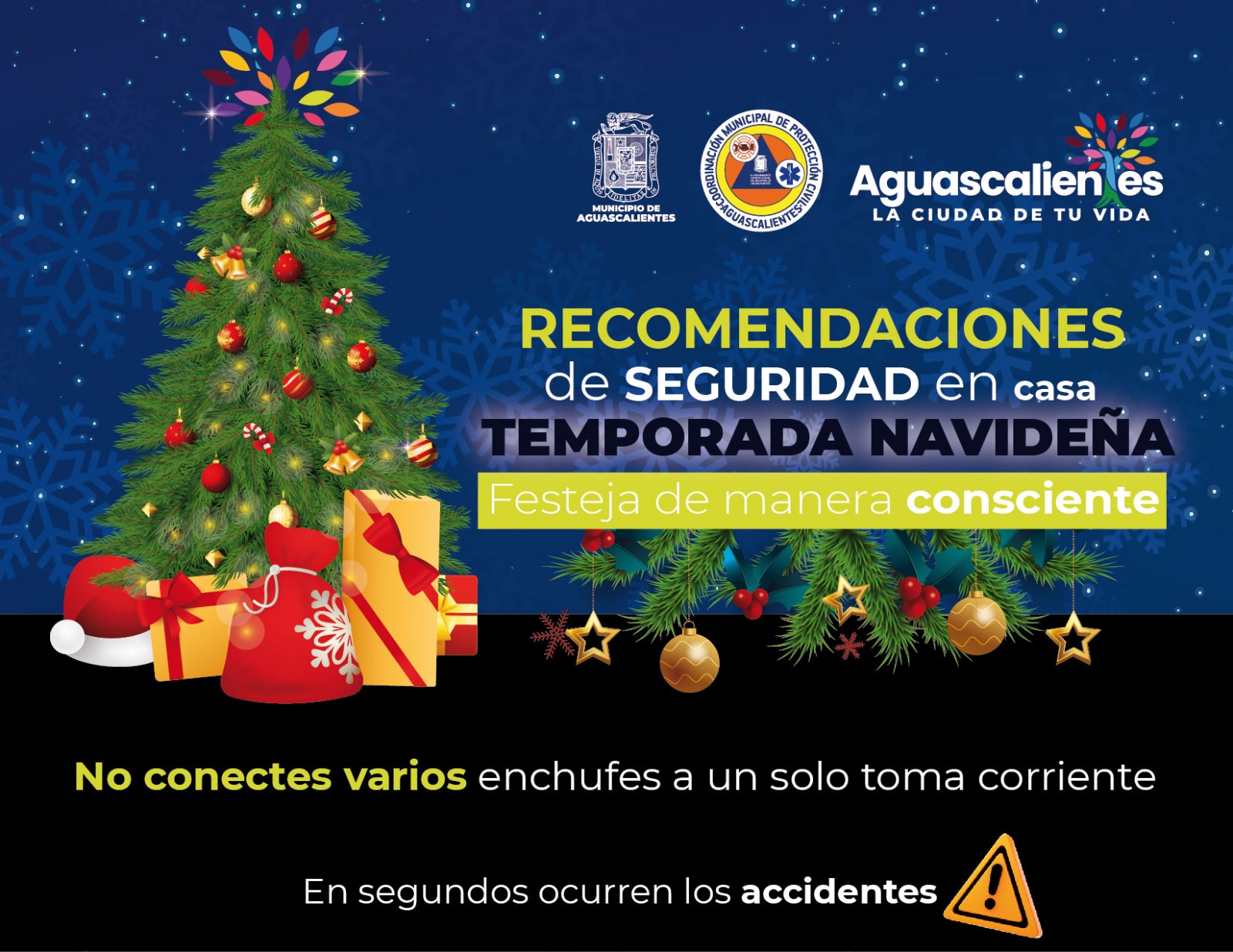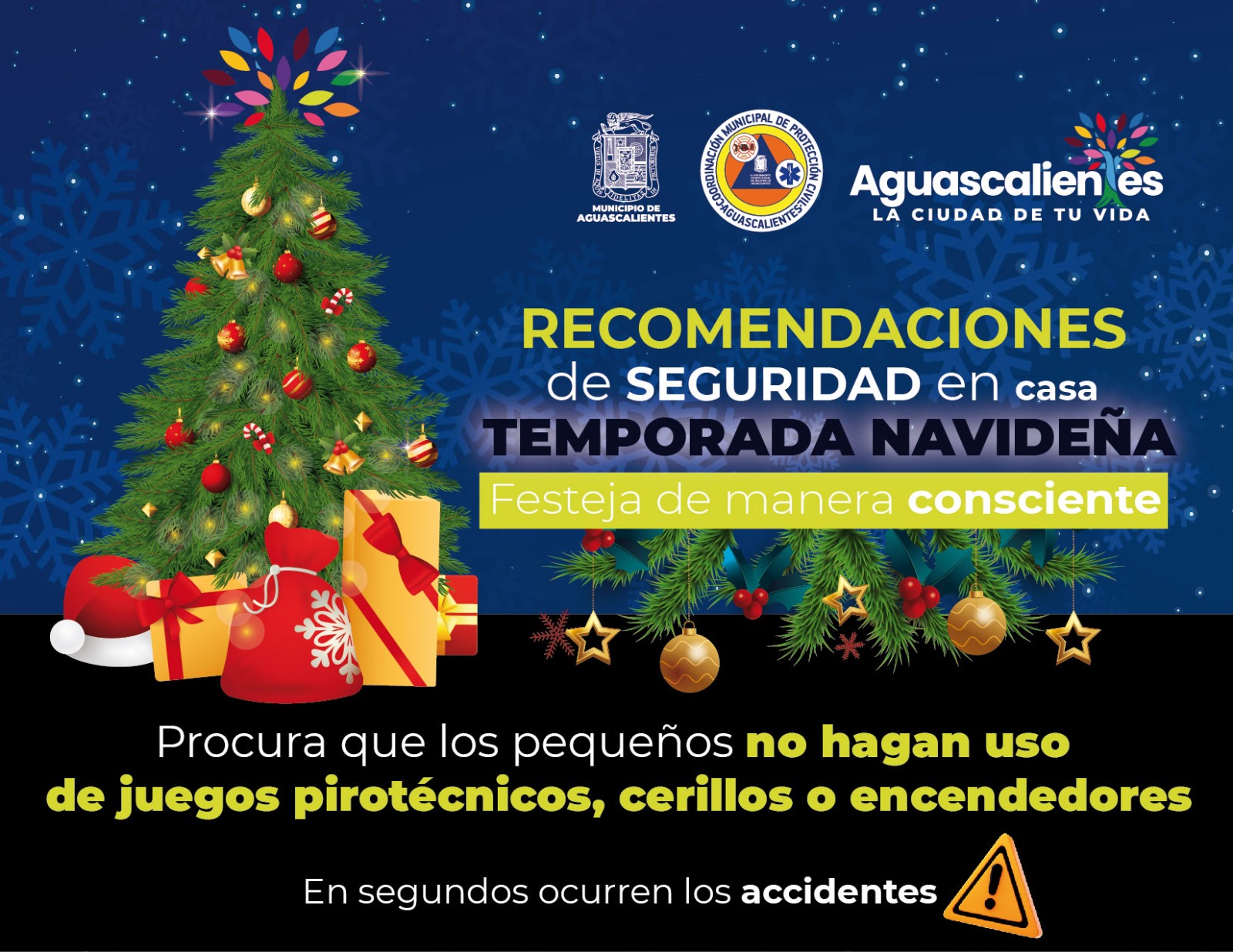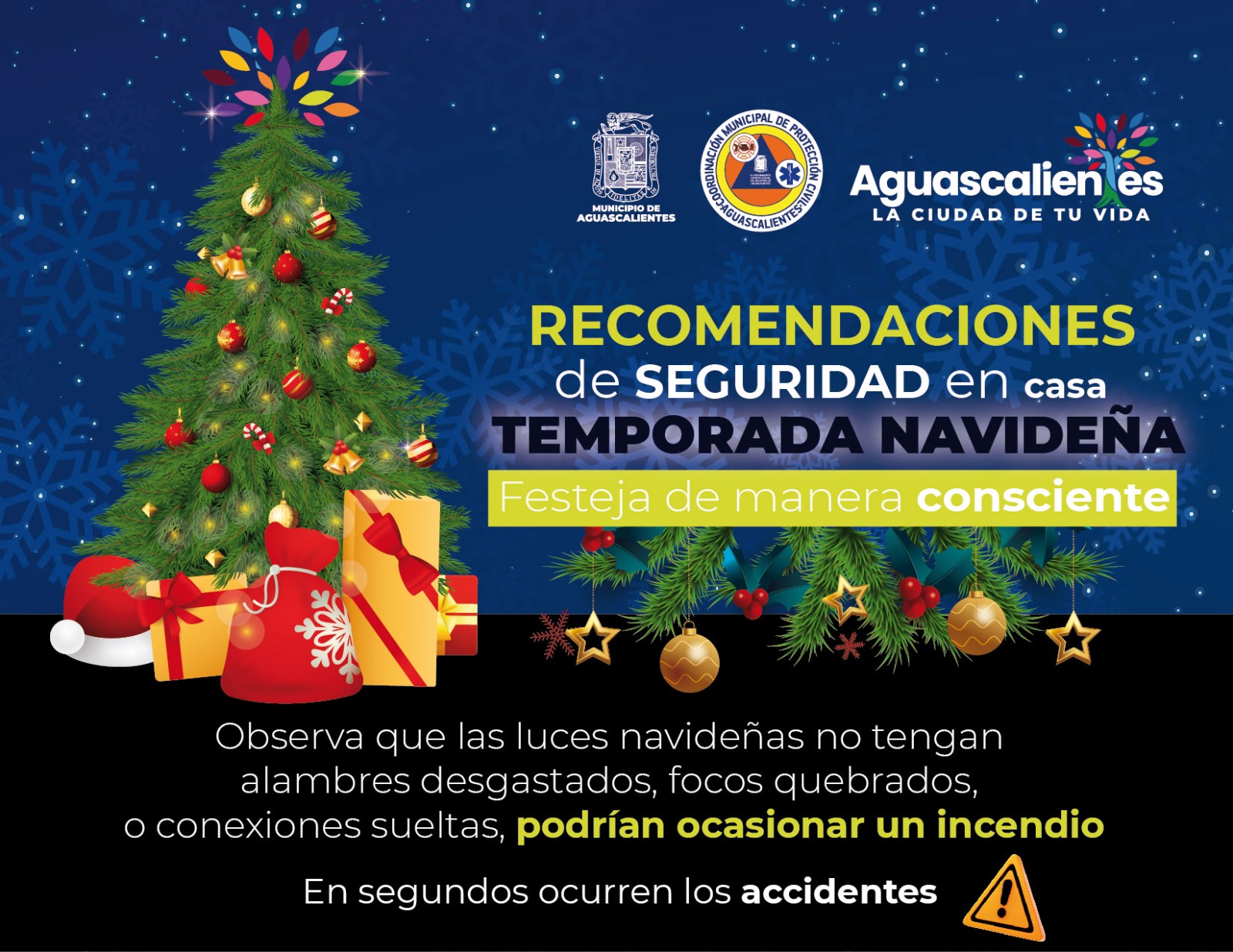La Coordinación Municipal de Protección Civil exhorta a la población a tomar medidas preventivas y de autocuidado en el hogar en esta temporada navideña, con el objetivo de festejar de manera consciente, para evitar accidentes que pongan en riesgo el patrimonio y la integridad física.