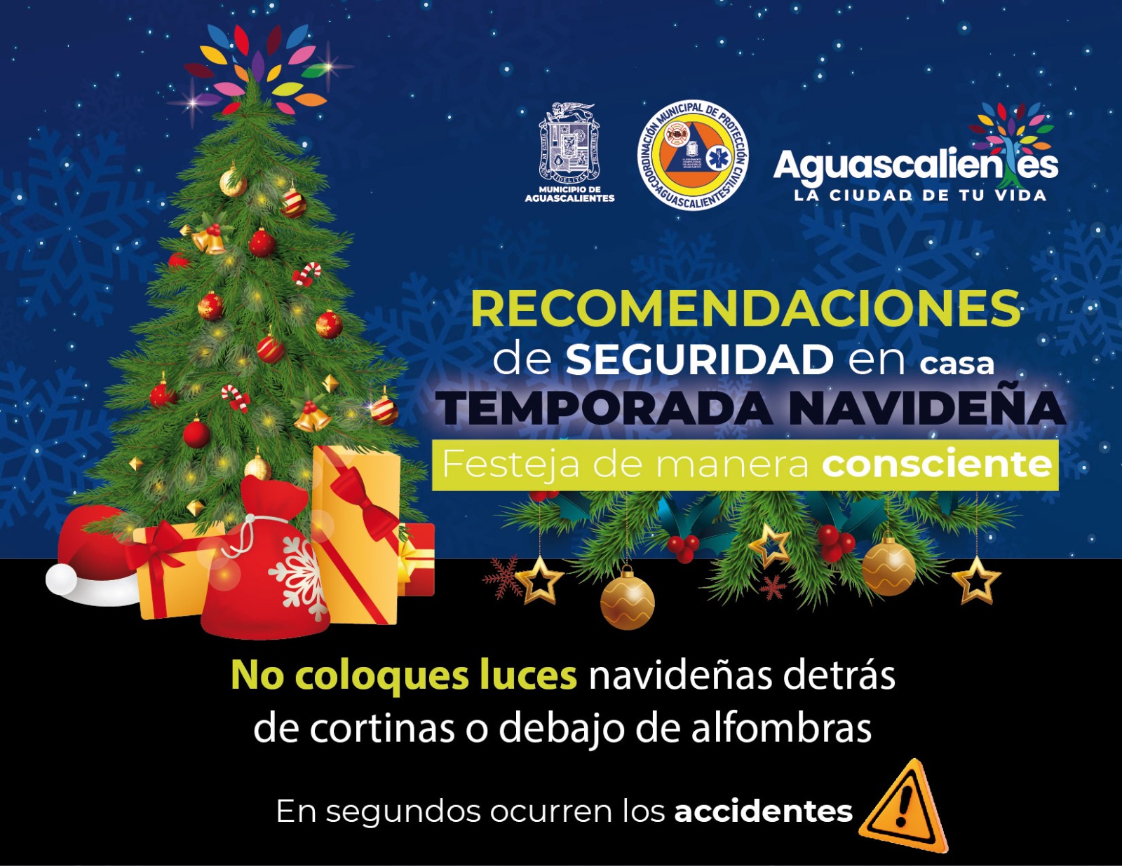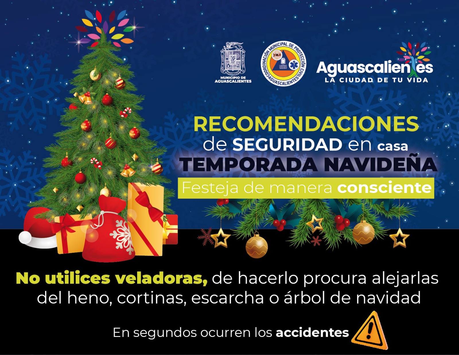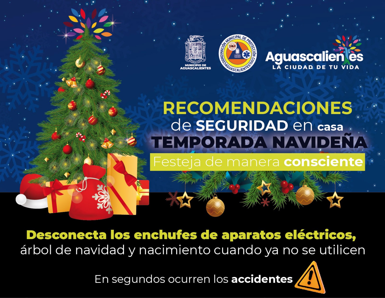 La Coordinación Municipal de Protección Civil exhorta a la población a tomar medidas preventivas y de autocuidado en el hogar en esta temporada navideña, con el objetivo de festejar de manera consciente, para evitar accidentes que pongan en riesgo el patrimonio y la integridad física.