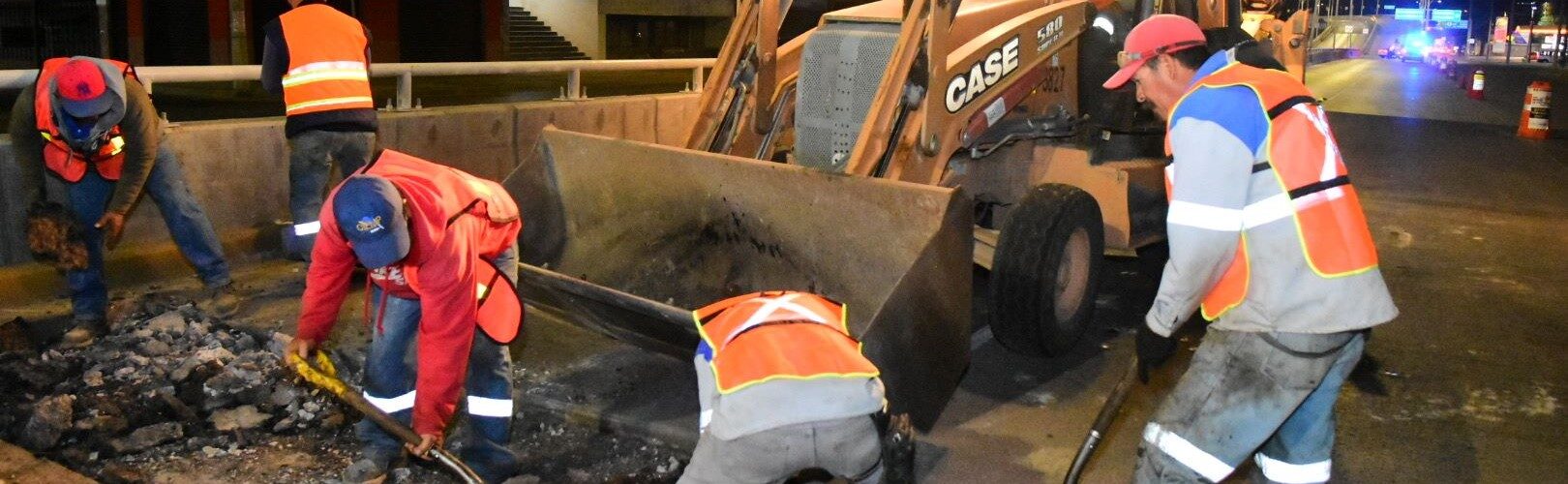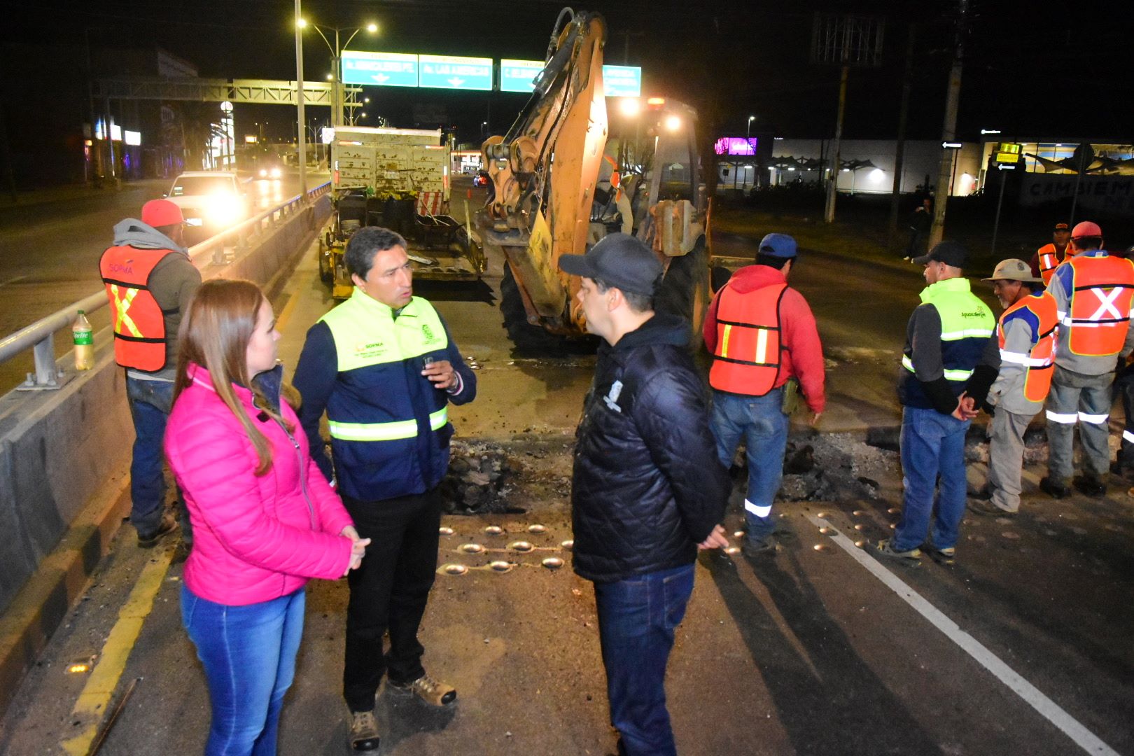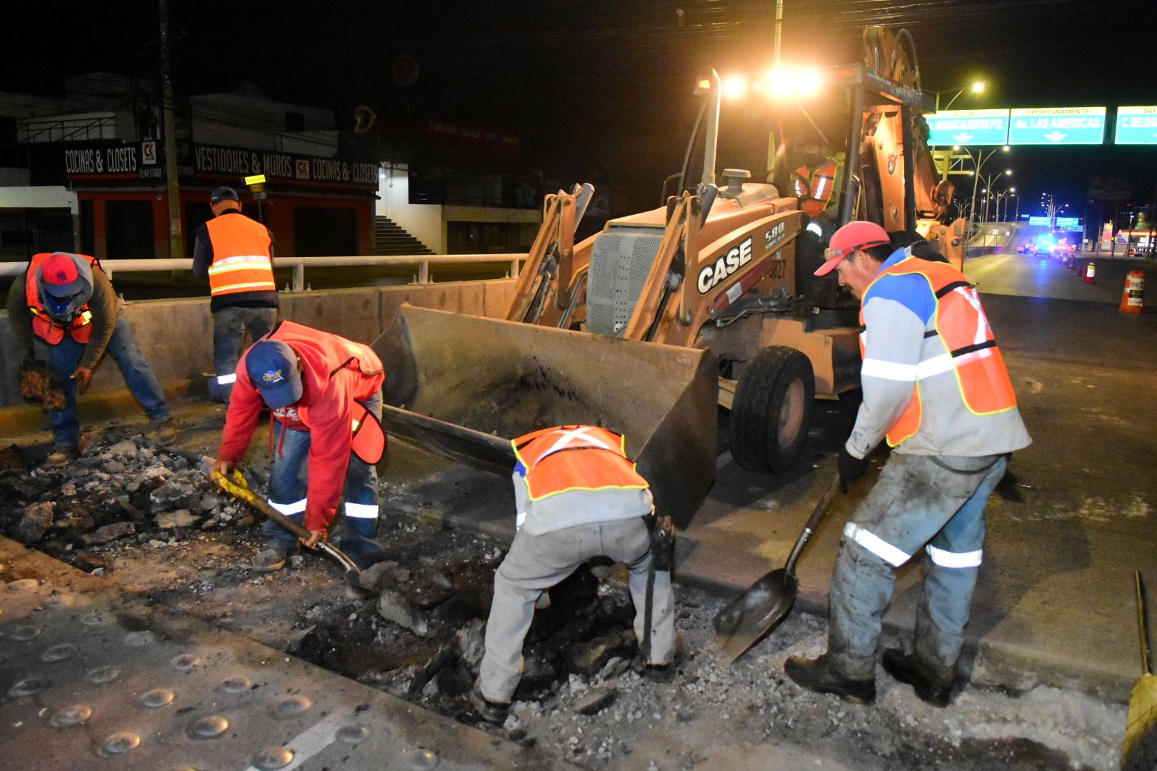 Las cuadrillas de trabajadores de la Secretaría de Obras Públicas del Municipio de Aguascalientes (SOPMA), trabajan de forma estratégica durante las noches en calles y avenidas principales, para no cerrar la circulación a los conductores en horas de mayor tráfico.