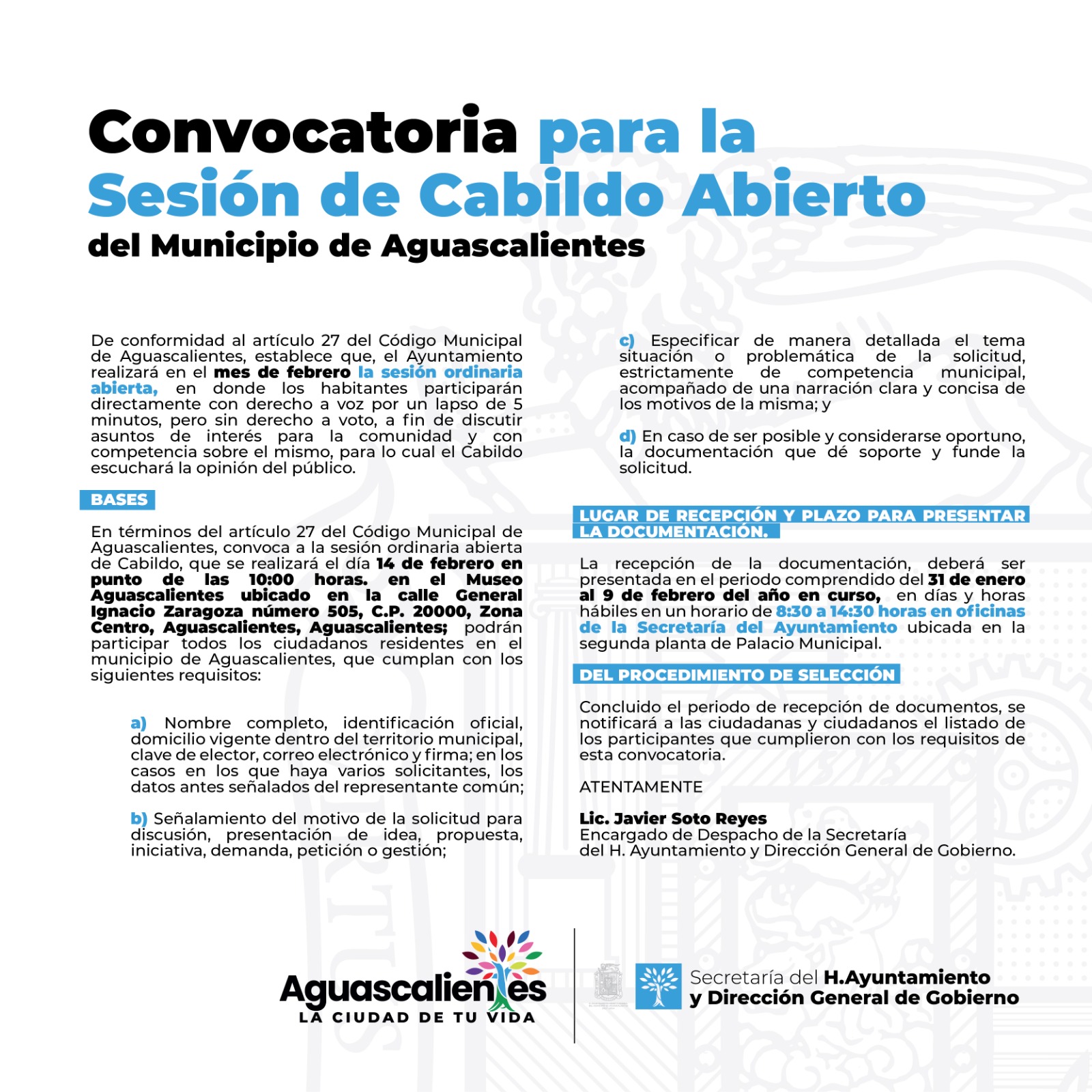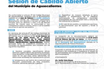 El Municipio de Aguascalientes a través de la Secretaría del H. Ayuntamiento y Dirección General de Gobierno, abre convocatoria e invita a la ciudadanía a participar en la primera Sesión Ordinaria Abierta de Cabildo de 2024.
