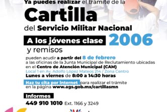 Se invita a los jóvenes y remisos a realizar su cita por internet en www.ags.gob.mx/cartillasmn; en donde encontrarán también los requisitos para que puedan obtener su documento, en el Centro de Atención Municipal (CAM), local 1, en López Mateos 214, zona centro, de lunes a viernes, de 08:00 a 14:30 horas.