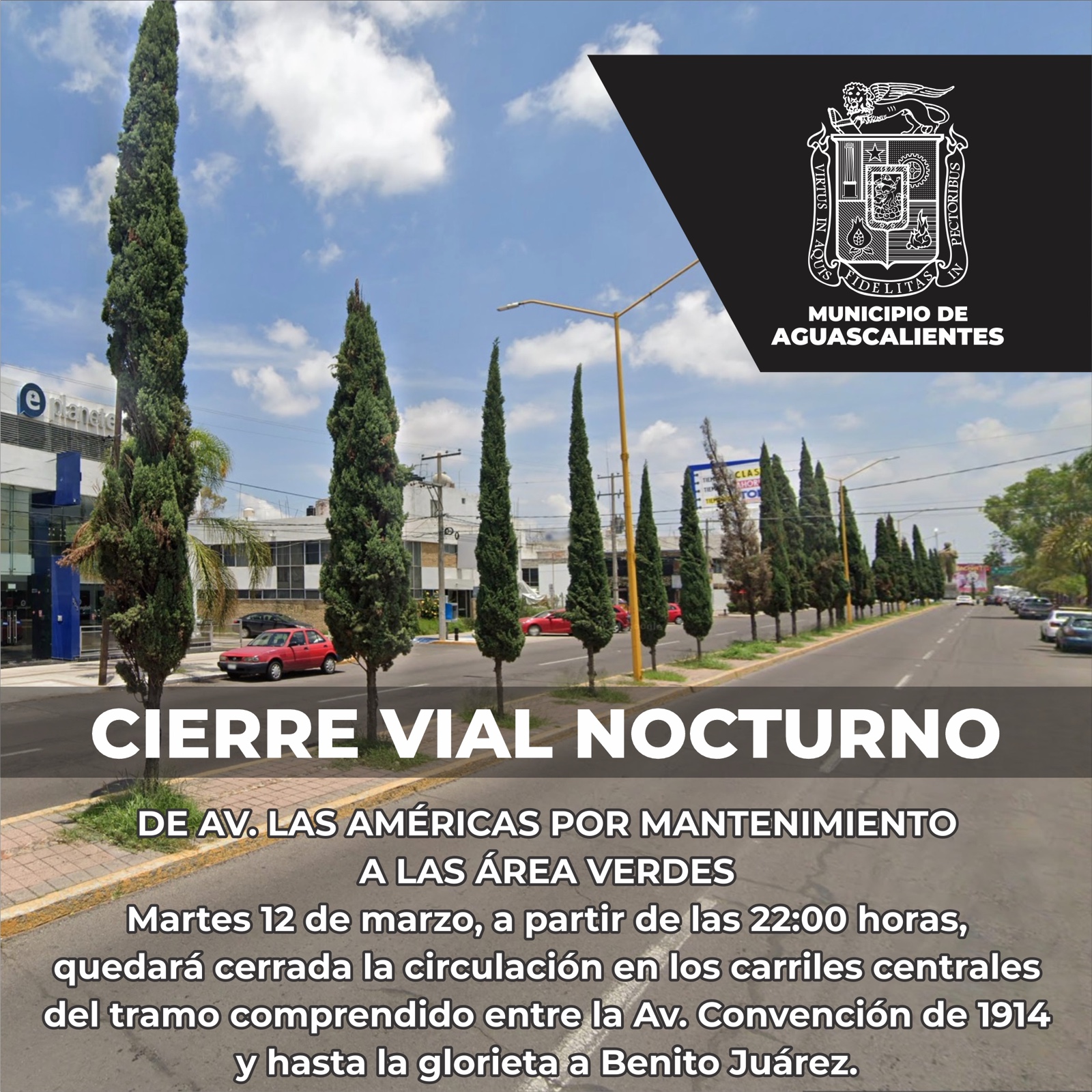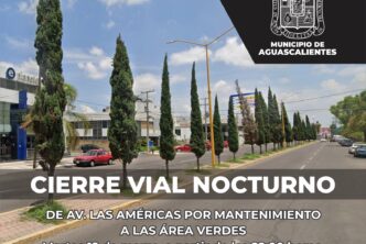 El Municipio de Aguascalientes llevará a cabo cierres parciales nocturnos de los carriles centrales de la Avenida Las Américas, para poder llevar a cabo trabajos de mantenimiento de las áreas verdes del camellón.