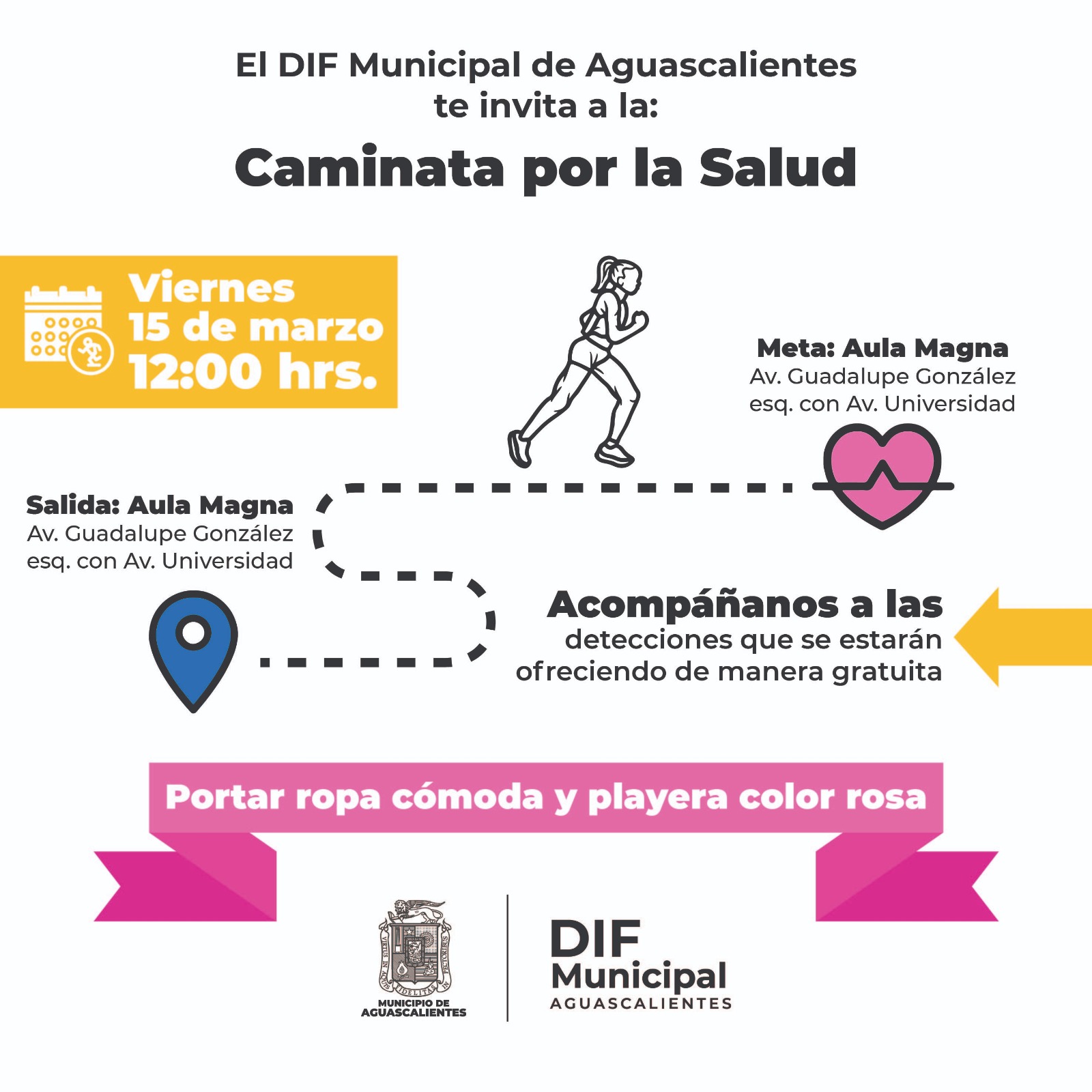 El DIF Municipal de Aguascalientes, invita a la ciudadanía a participar en la “Caminata por la Salud”, que se llevará a cabo el viernes 15 de marzo a las 12:00 horas, un evento dedicado a promover la salud física.