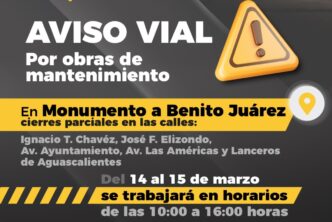 El Municipio de Aguascalientes, a través de la Secretaría de Obras Públicas Municipales, dio a conocer los cierres viales parciales de las calles Ignacio T. Chávez, Av. Las Américas, Lanceros de Aguascalientes, Av. Ayuntamiento y José F. Elizondo, que convergen en la Glorieta del Monumento a Benito Juárez, para llevar a cabo trabajos de bacheo intensivo.