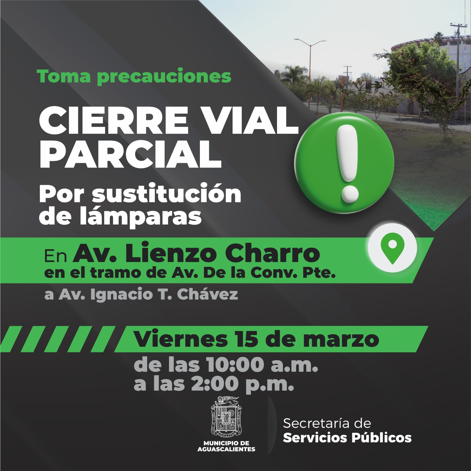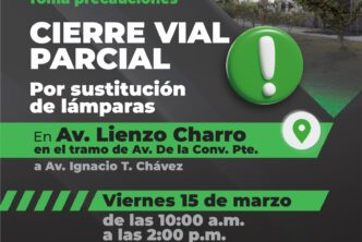 La Secretaría de Servicios Públicos del Municipio de Aguascalientes a través de la Dirección de Alumbrado, hace un llamado a la ciudadanía a tomar las debidas precauciones, debido a que por trabajos de mantenimiento se efectuarán cierres parciales este viernes 15 de marzo en la avenida Lienzo Charro.