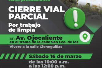 Este sábado 16 de marzo, la Secretaría de Servicios Públicos realizará cierres parciales a la circulación en los arroyos viales de Av. Ojocaliente, desde la calle San Francisco de los Viveros y hasta el cruce con la calle Cieneguillas, para realizar trabajos de limpieza en camellón y accesos peatonales en la zona.