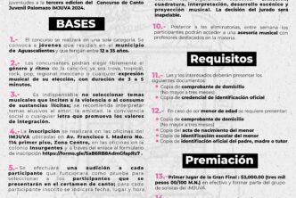 El Instituto Municipal de la Juventud de Aguascalientes (Imjuva) invita a las juventudes a participar en la tercera edición del concurso de canto “Palomazo” 2024, el cual se llevará a cabo en diferentes puntos de la ciudad.