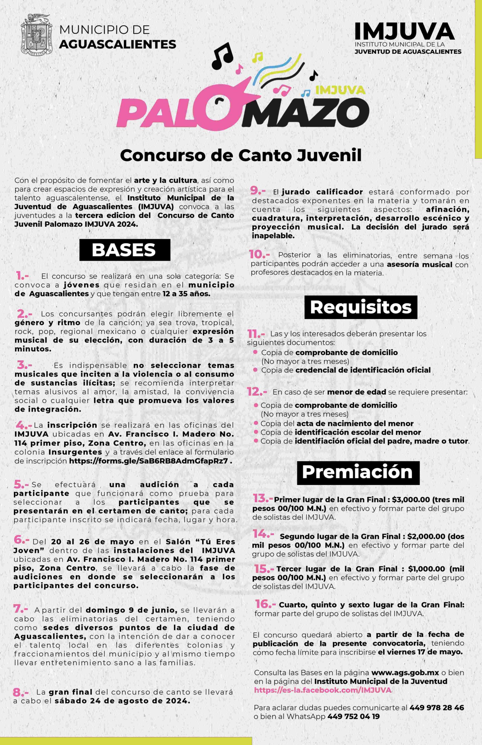 El Instituto Municipal de la Juventud de Aguascalientes (Imjuva) invita a las juventudes a participar en la tercera edición del concurso de canto “Palomazo” 2024, el cual se llevará a cabo en diferentes puntos de la ciudad.