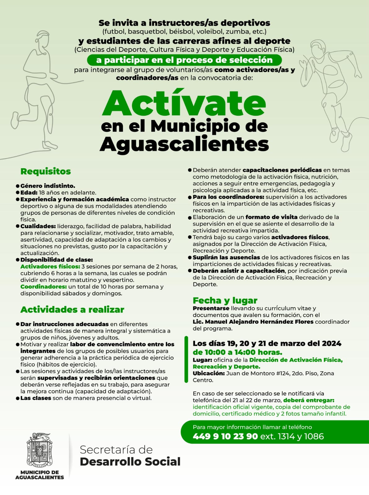 El Municipio de Aguascalientes invita a instructores/as deportivos  de futbol, basquetbol, béisbol, voleibol, zumba, entre otros y a estudiantes de las carreras afines al deporte como Ciencias del Deporte, Cultura Física y Deporte y Educación Física, a participar en el proceso de selección para integrarse al grupo de voluntarios/as como activadores/as y coordinadores/as y participar en la convocatoria Actívate en el Municipio de Aguascalientes.