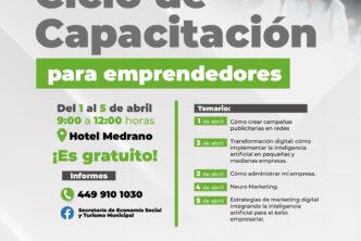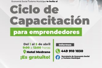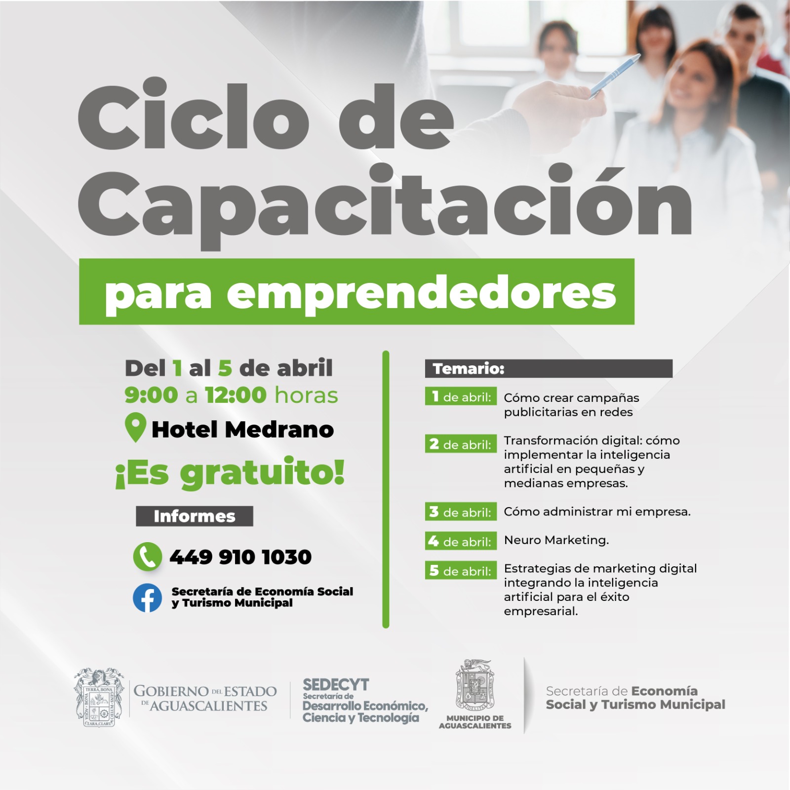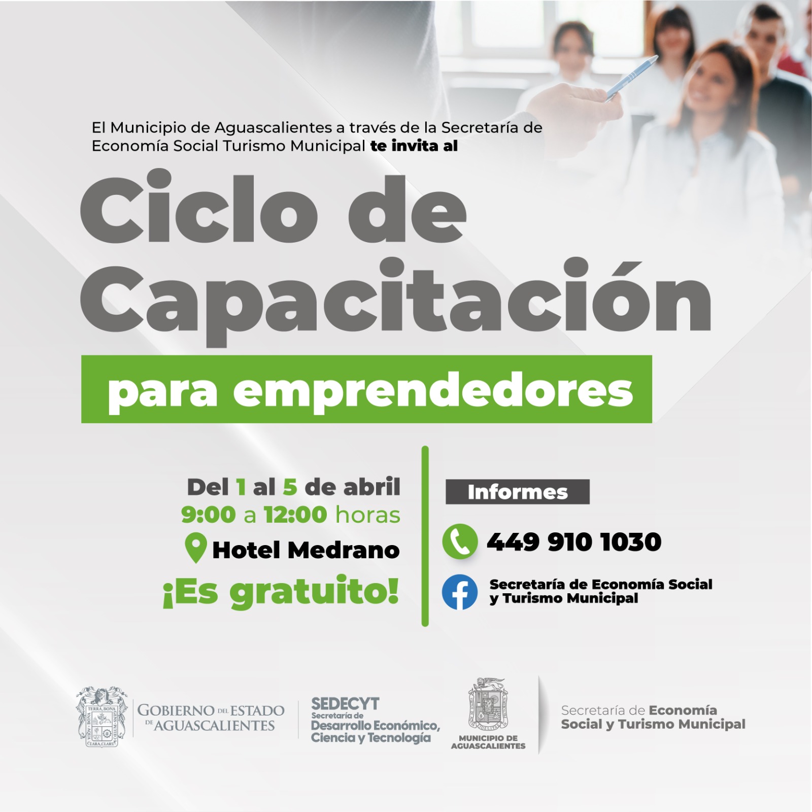 La Secretaría de Economía Social Turismo Municipal (Setum), en colaboración con la Secretaría de Desarrollo Económico, Ciencia y Tecnología (SEDECYT), invitan a participar en el ciclo de capacitación para emprendedores, que se llevará a cabo del 1 al 5 de abril en el Hotel Medrano, de 9:00 a 12:00 horas.