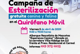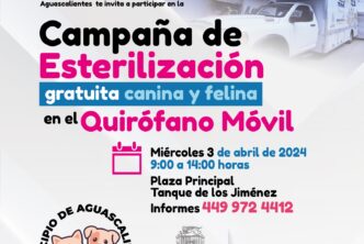 La Coordinación General de Salud del Municipio de Aguascalientes invita a las y los dueños de mascotas a acercarse a las campañas de esterilización gratuitas caninas y felinas en el Quirófano Veterinario Móvil.