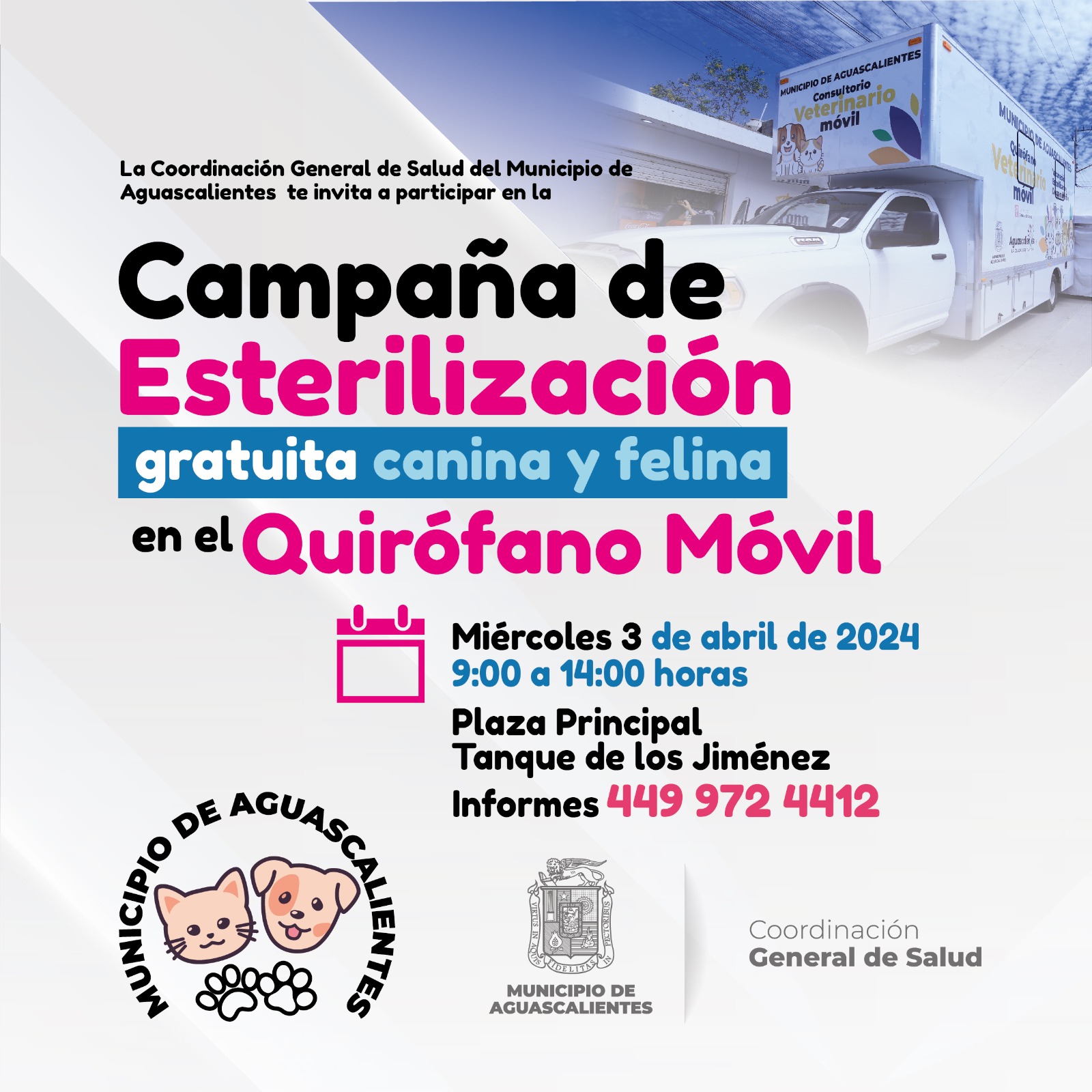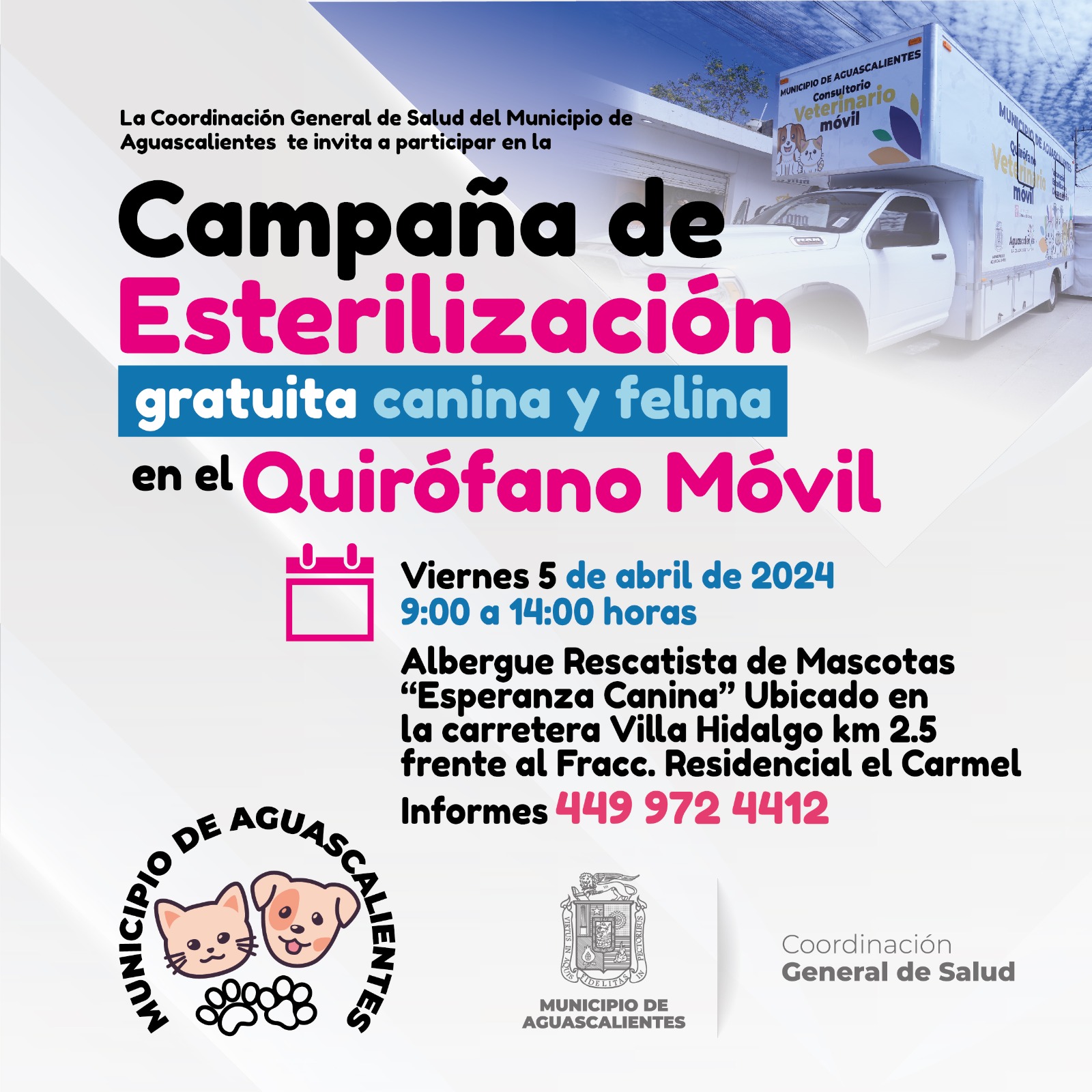 La Coordinación General de Salud del Municipio de Aguascalientes invita a las y los dueños de mascotas a acercarse a las campañas de esterilización gratuitas caninas y felinas en el Quirófano Veterinario Móvil.