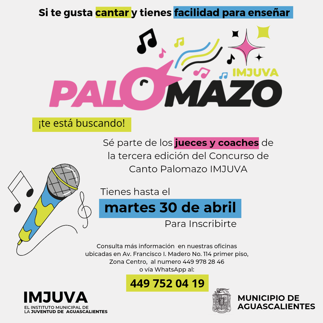 La fecha límite de registro es el martes 30 de abril. Los interesados en formar parte del equipo de coaches y jueces del concurso de canto «Palomazo 2024» pueden consultar los requisitos y realizar su inscripción en las oficinas del IMJUVA ubicadas en Av. Francisco I. Madero 114, primer piso, Zona Centro, asimismo en el numero 449 978 28 46 o vía WhatsApp al 449 752 04 19.