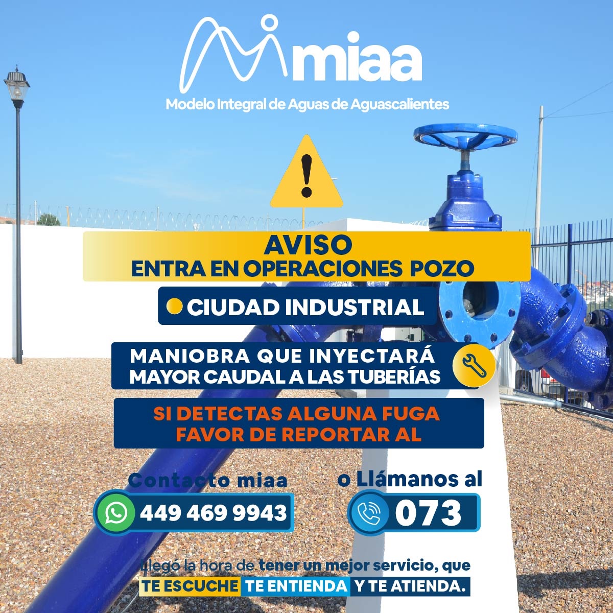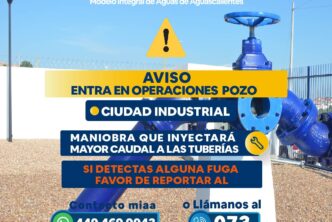 El Modelo Integral de Aguas de Aguascalientes (MIAA), da a conocer a la ciudadanía del sur de la ciudad, que entrará en operación el pozo 103-A, que se ubica en la avenida Julio Díaz Torre, en Ciudad Industrial.