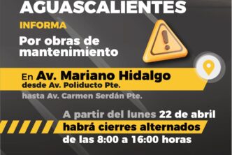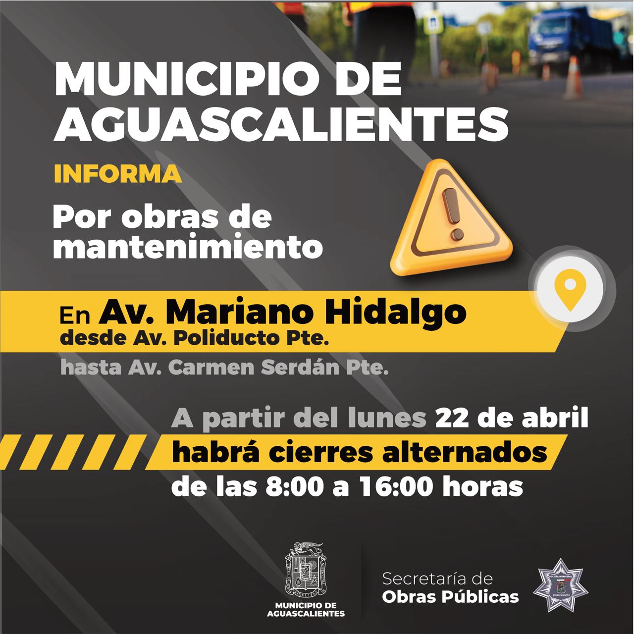 El Municipio de Aguascalientes, a través de la Secretaría de Obras Públicas (SOPMA), llevará a cabo el cierre a la circulación vial alternado en ambas calzadas de la Av. Mariano Hidalgo, en el tramo comprendido entre Av. Poliducto Poniente y Av. Carmen Serdán Poniente, en el fraccionamiento Mujeres Ilustres, para realizar trabajos de rehabilitación y colocación de concreto hidráulico.