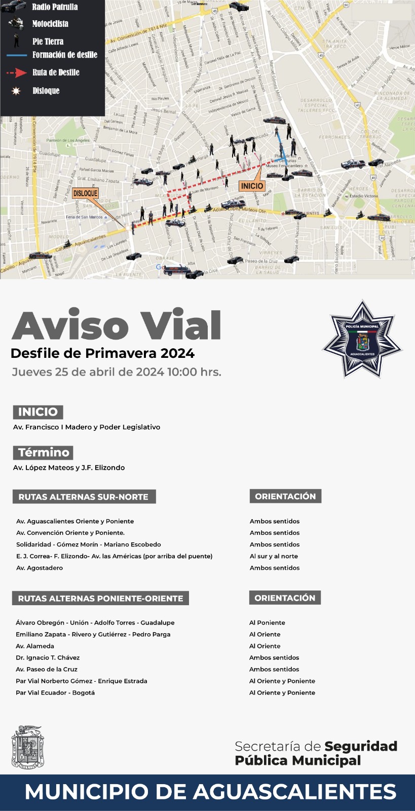 La Dirección de Movilidad desplegará oficiales para facilitar el flujo vehicular y promover rutas alternas durante el desfile. Entre las rutas sugeridas se encuentran las avenidas Aguascalientes Oriente y Poniente, Convención de 1914 Oriente y Poniente, Solidaridad, Gómez Morín, Mariano Escobedo, Eduardo J. Correa, F. Elizondo, Av. Las Américas, Agostadero, Álvaro Obregón, Unión, Adolfo Torres, Guadalupe, Emiliano Zapata, Rivero y Gutiérrez, Pedro Parga, Avenida Alameda, Dr. Ignacio T. Chávez, Avenida Paseo de la Cruz, el Par Vial Norberto Gómez-Enrique Estrada y el Par Vial Ecuador-Bogotá.