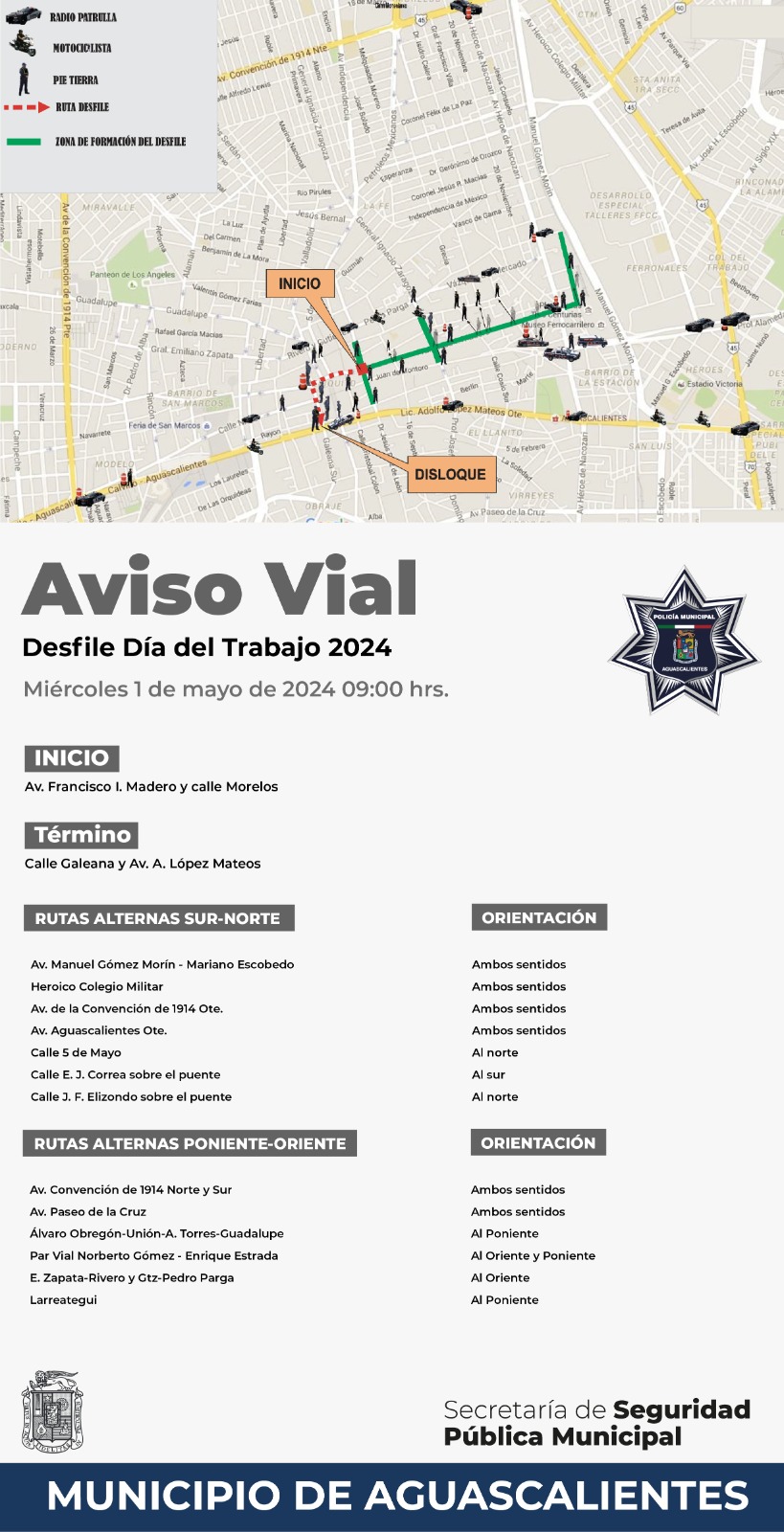La Policía Vial de la Secretaría de Seguridad Municipal de Aguascalientes (SSPM) desplegará un operativo el próximo 1 de mayo, con motivo del desfile cívico-obrero del Día del Trabajo, a realizarse en la zona centro de la capital.