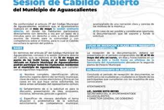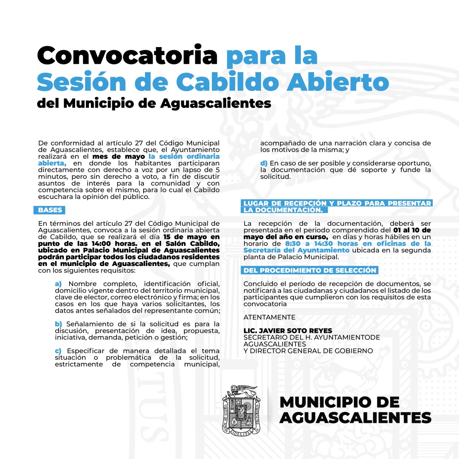 La Secretaría del H. Ayuntamiento y la Dirección General de Gobierno del Municipio de Aguascalientes, con el objetivo de fomentar la participación ciudadana en los asuntos de interés público, abren la convocatoria para la Sesión Ordinaria Abierta de Cabildo Mayo 2024.