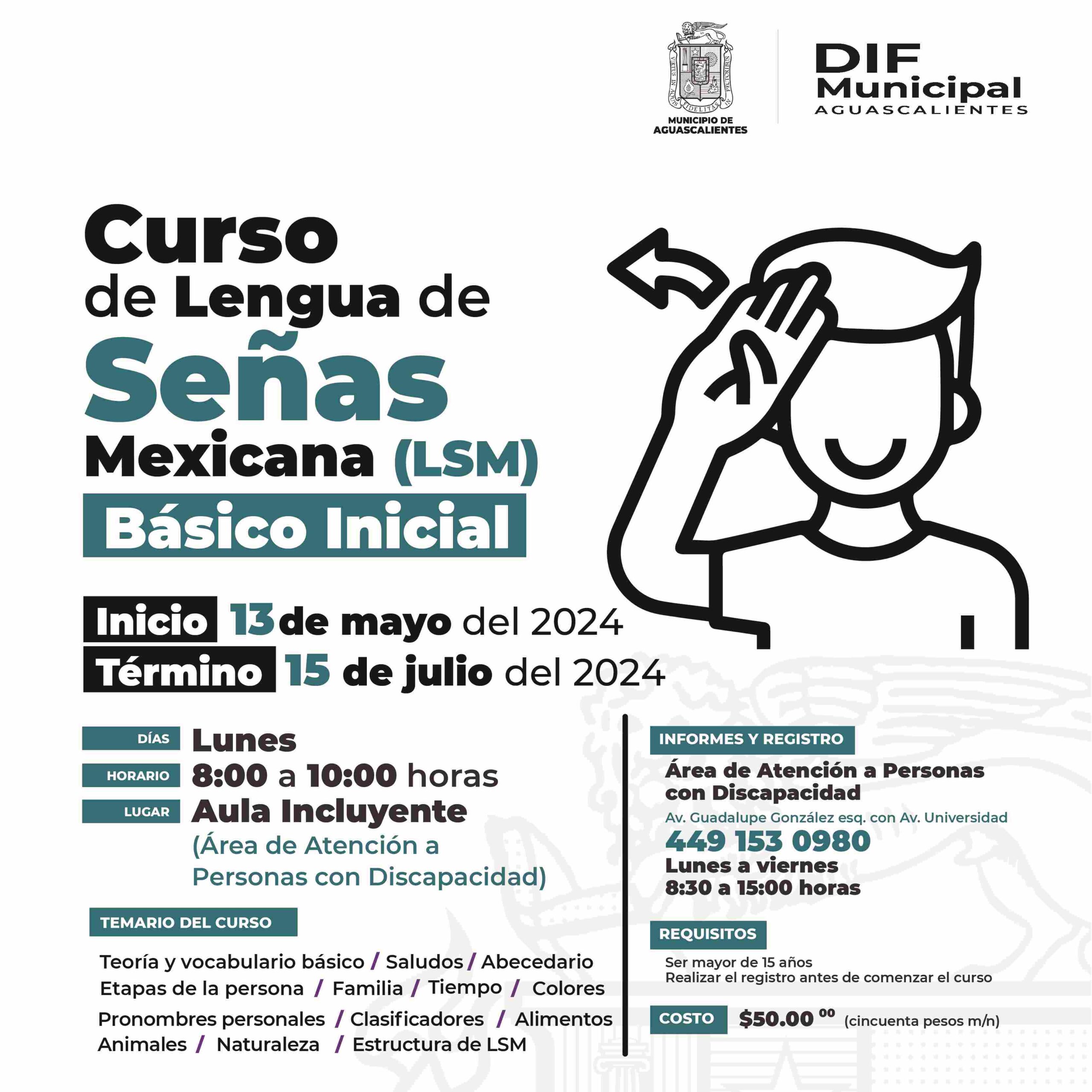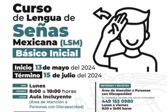 El curso básico inicial de Lengua de Señas Mexicana tendrá una duración de veinte horas, inicia el 13 de mayo y concluye el 15 de julio y será impartido los lunes  de 08:00 a 10:00 horas.
