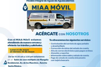 El Modelo Integral de Aguas de Aguascalientes (MIAA), informa que la Unidad de Atención Móvil visitará a usuarios del fraccionamiento Mangata, del lunes 6 al viernes 10 de mayo de 2024.
