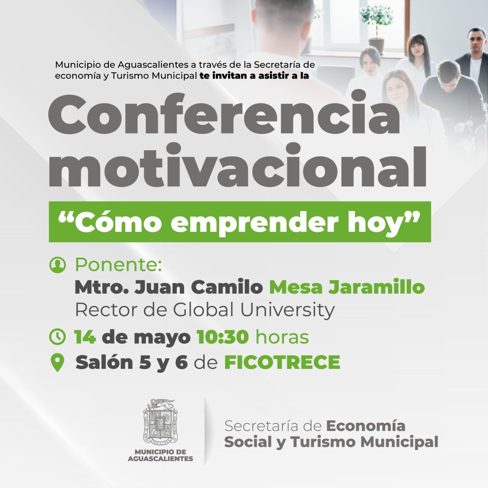 El Municipio de Aguascalientes a través de la Secretaría de Economía Social y Turismo Municipal, brindará una Conferencia Motivacional para Emprendedores, titulada «Cómo Emprender Hoy», la cual será impartida por el Mtro. Juan Camilo Mesa Jaramillo, rector de Global University. Este evento se llevará a cabo el día 14 de mayo del 2024, a partir de las 10:30 horas, en FICOTRECE.