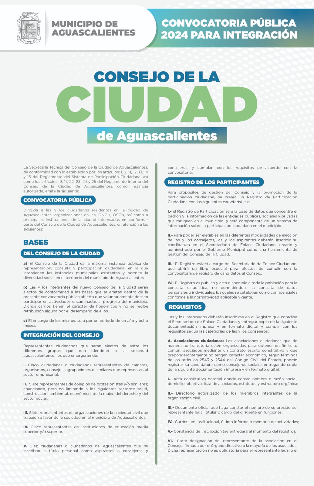 La convocatoria puede consultarse en redes sociales del Municipio de Aguascalientes y a través del siguiente enlace: https://www.ags.gob.mx/publicacion/CONVOCATORIA%20CONSEJO%20DE%20LA%20CIUDAD.pdf