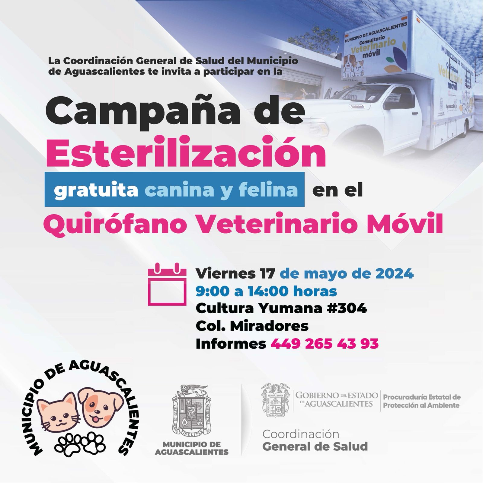 Esta semana, en primera instancia el Quirófano Veterinario Móvil estará el miércoles 15 de mayo en la calle Dr. Francisco Guel Jiménez esquina Roberto Jefkins, colonia Palomino Dena.