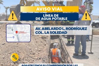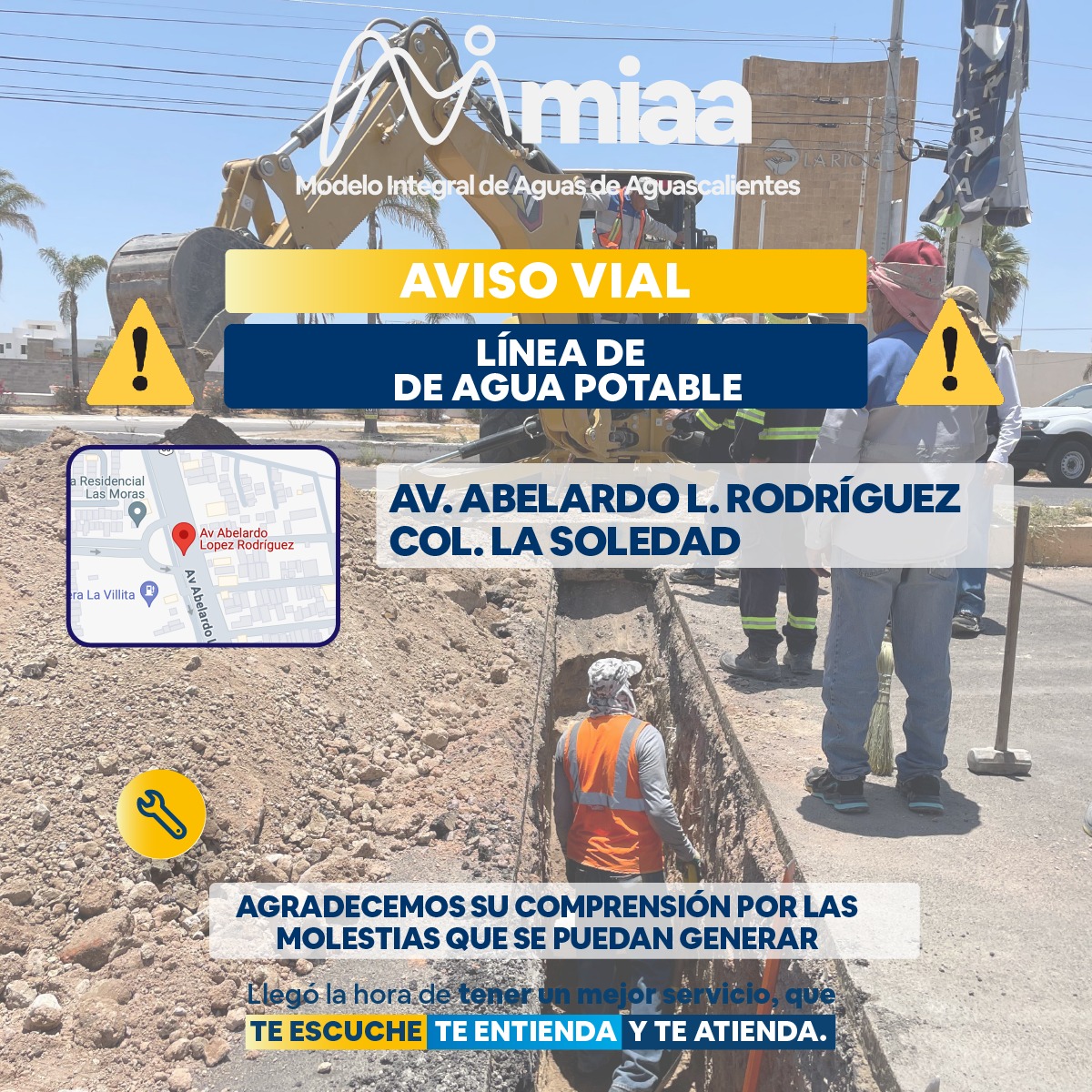 El Modelo Integral de Aguas de Aguascalientes (MIAA), avisa sobre el cierre vial parcial de la Av. Abelardo Rodríguez esquina con la calle Tlaquepaque en el Fraccionamiento La Soledad, por los trabajos de instalación de 3.8 kilómetros de tubería de agua potable.