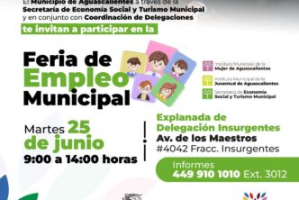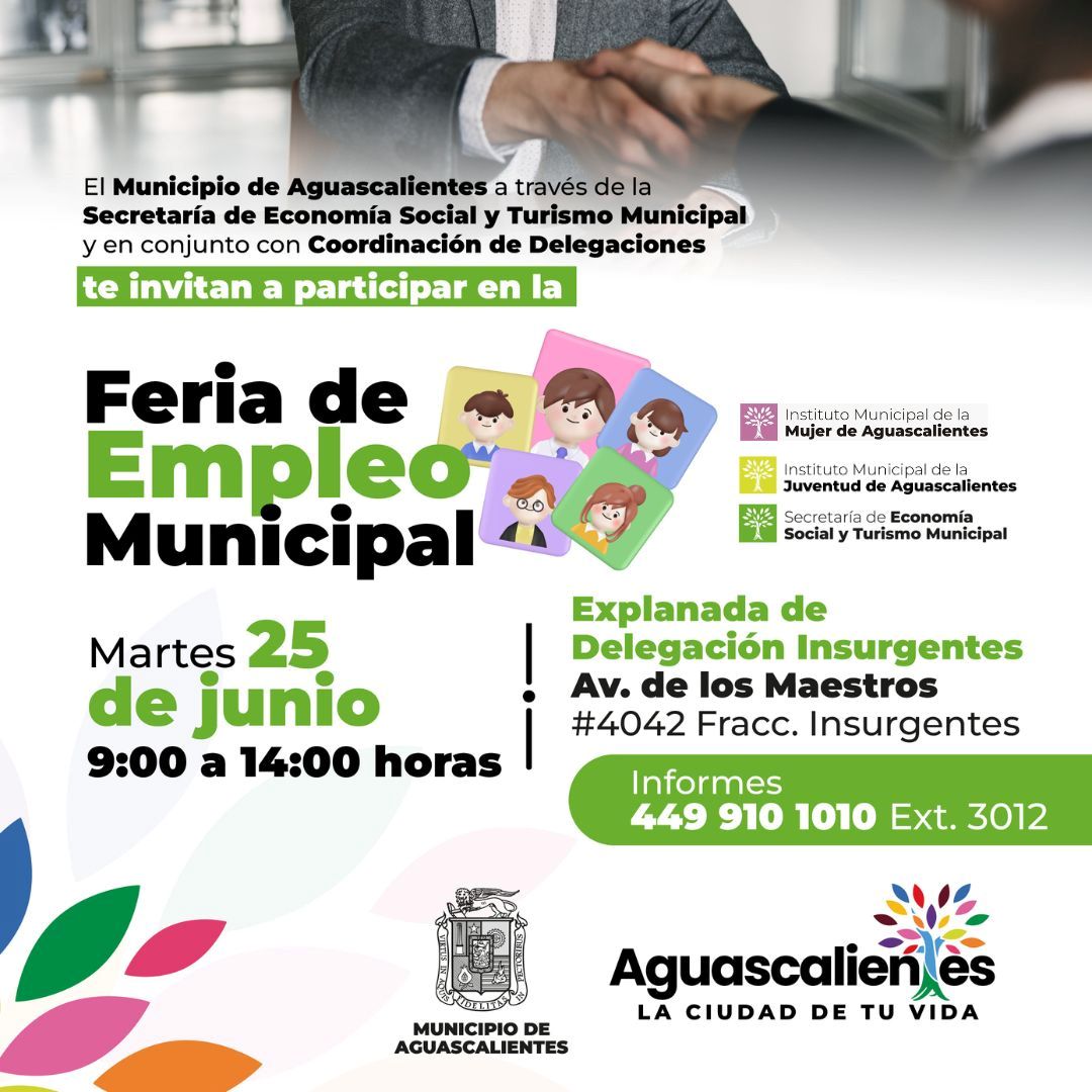 La Secretaría de Economía Social y Turismo Municipal (Setum) y la Coordinación General de Delegaciones Urbanas y Rurales, invitan a la Feria de Empleo Municipal, la cual se llevará a cabo el martes 25 de junio en la explanada de la Delegación Insurgentes, ubicada en Av. de los Maestros 4042, Fracc. Insurgentes, de 9:00 a 14:00 horas.