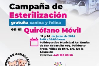 El Municipio de Aguascalientes a través de la Coordinación General de Salud, invita a la campaña de esterilización gratuita canina y felina en el quirófano veterinario móvil, que en esta ocasión se llevará a cabo el 19 y 26 de junio en el fraccionamiento Villas de Nuestra Señora de la Asunción.