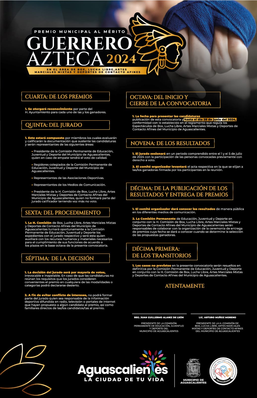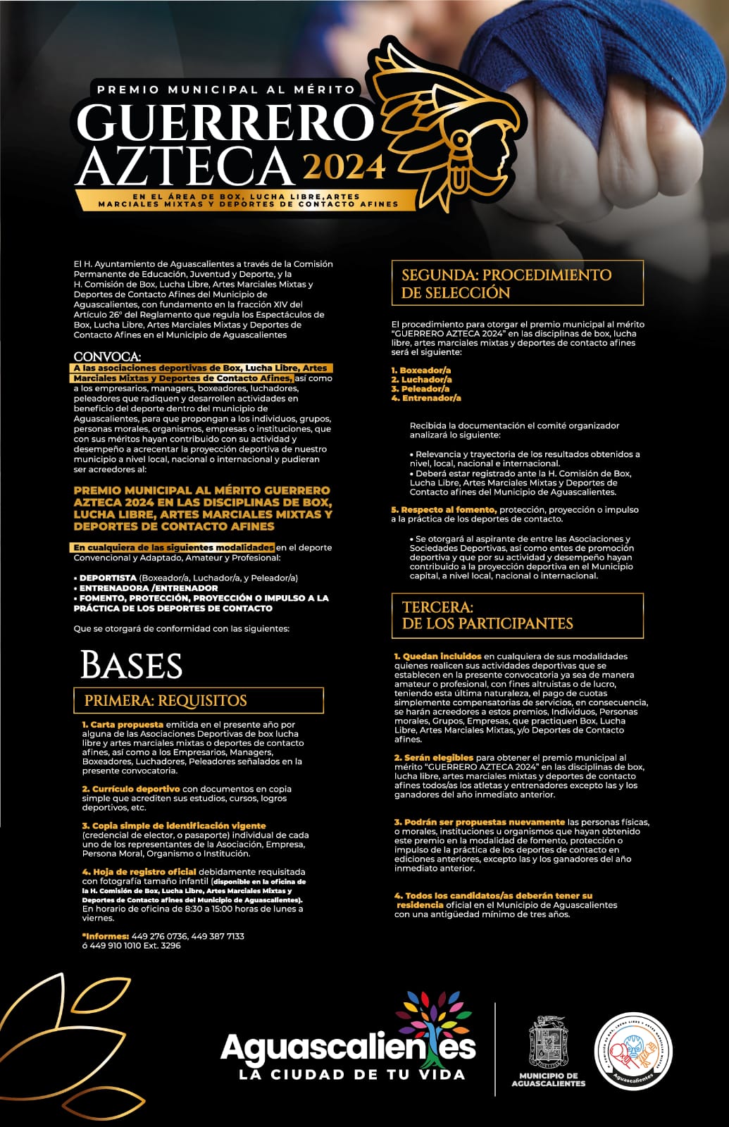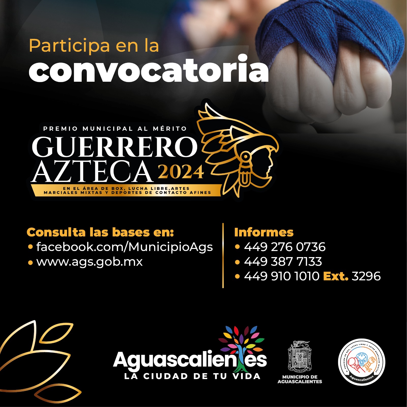 La Presidencia Municipal de Aguascalientes, a través de la Comisión Permanente de Educación, Juventud y Deporte junto con la H. Comisión de Box, Lucha Libre, Artes Marciales Mixtas y Deportes de Contacto Afines, invita a participar en la tercera edición del Premio Municipal al Mérito Guerrero Azteca 2024.