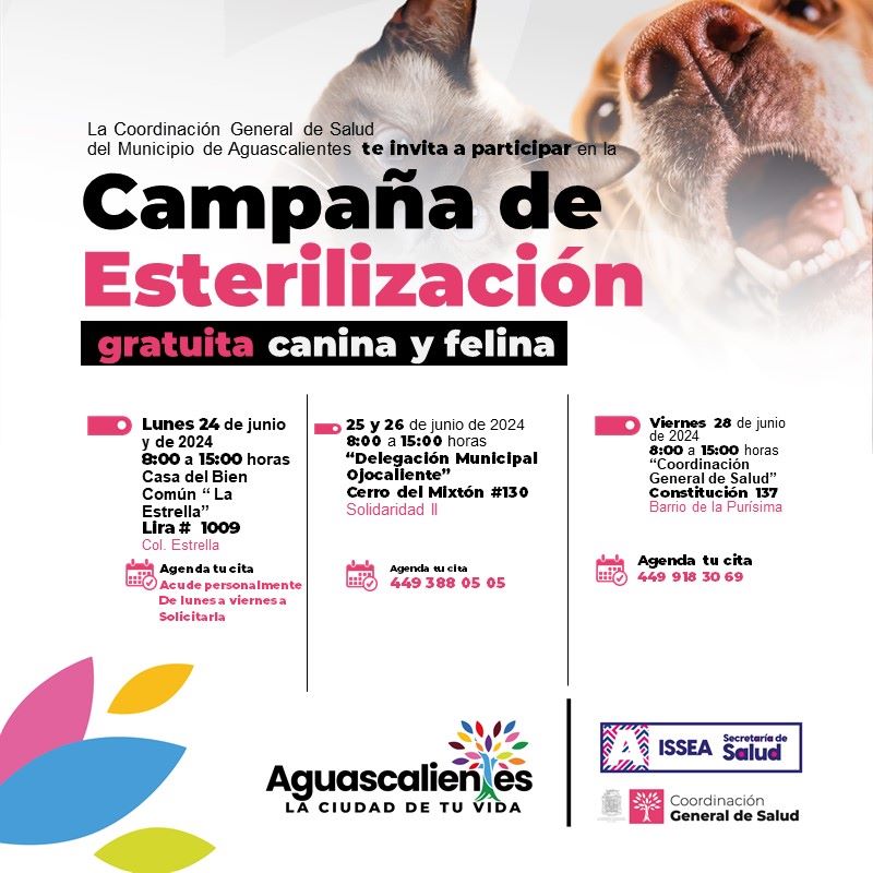 El Municipio de Aguascalientes en conjunto con la Secretaría de Salud del Estado de Aguascalientes (ISSEA), refuerzan la campaña de esterilización gratuita canina y felina, las cuales se llevarán en distintas sedes en la última semana de junio.