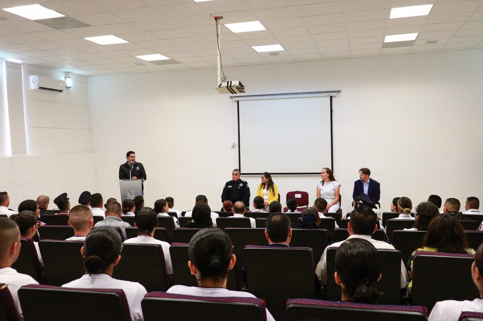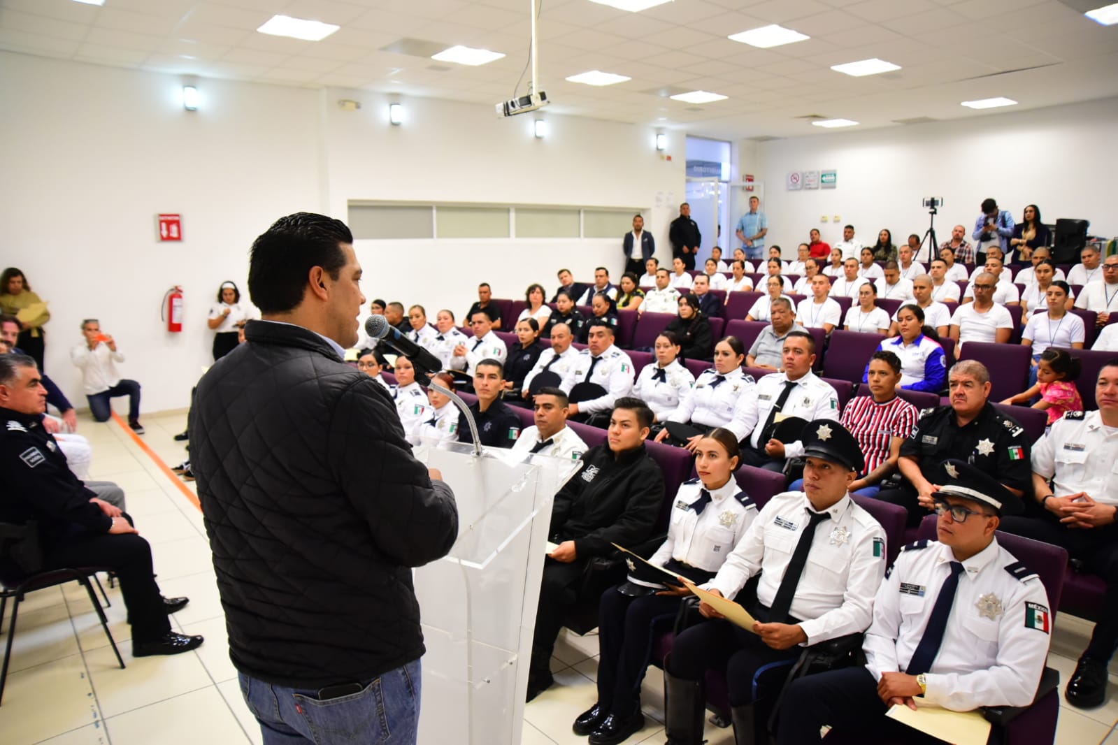 En la ceremonia celebrada en el auditorio del Instituto Superior en Seguridad Pública (ISSP), Leo Montañez dirigió un mensaje a 32 integrantes de la policía municipal, quienes se graduaron de bachillerato, y los felicitó por alcanzar una meta más, por ser un ejemplo para sus familias y superarse día con día.