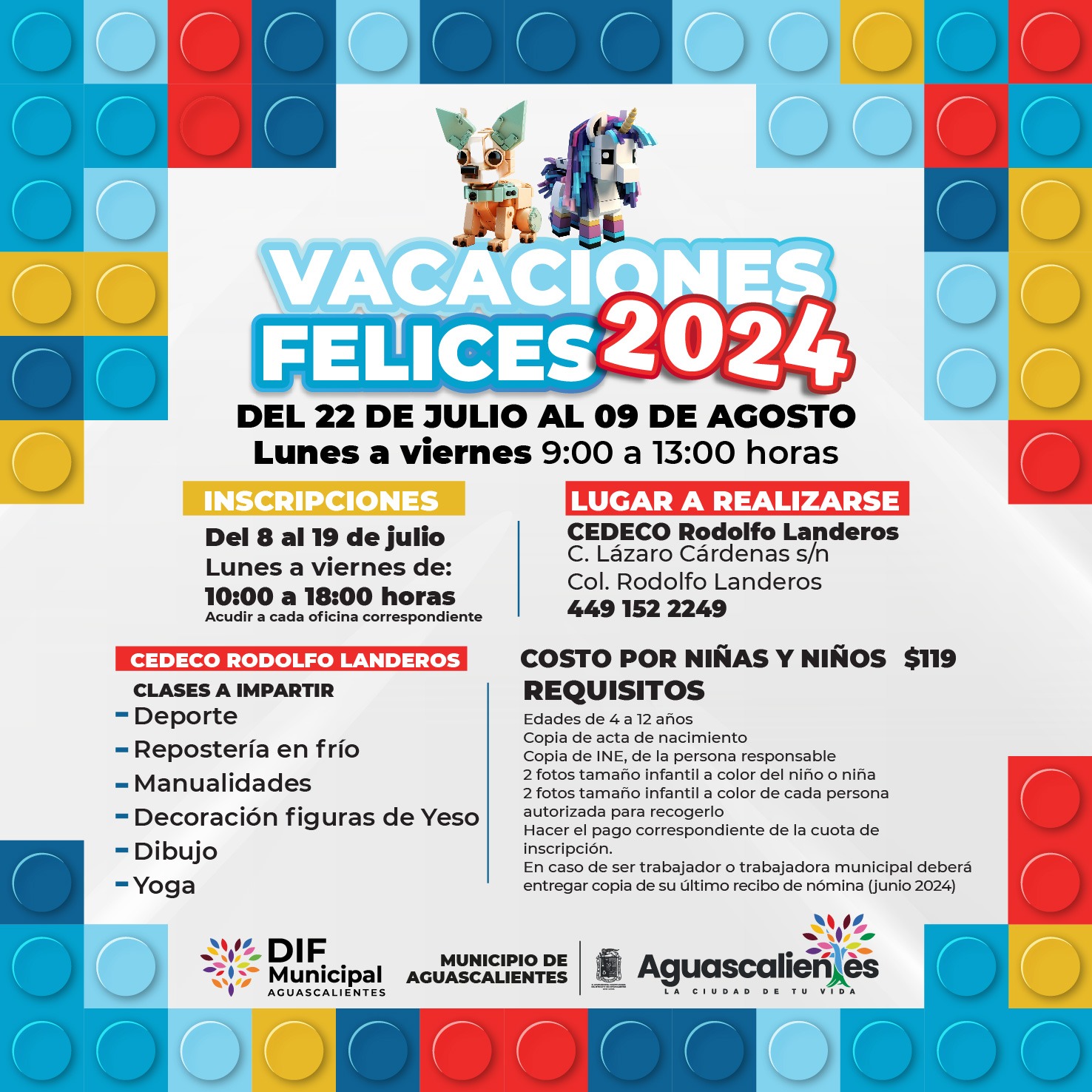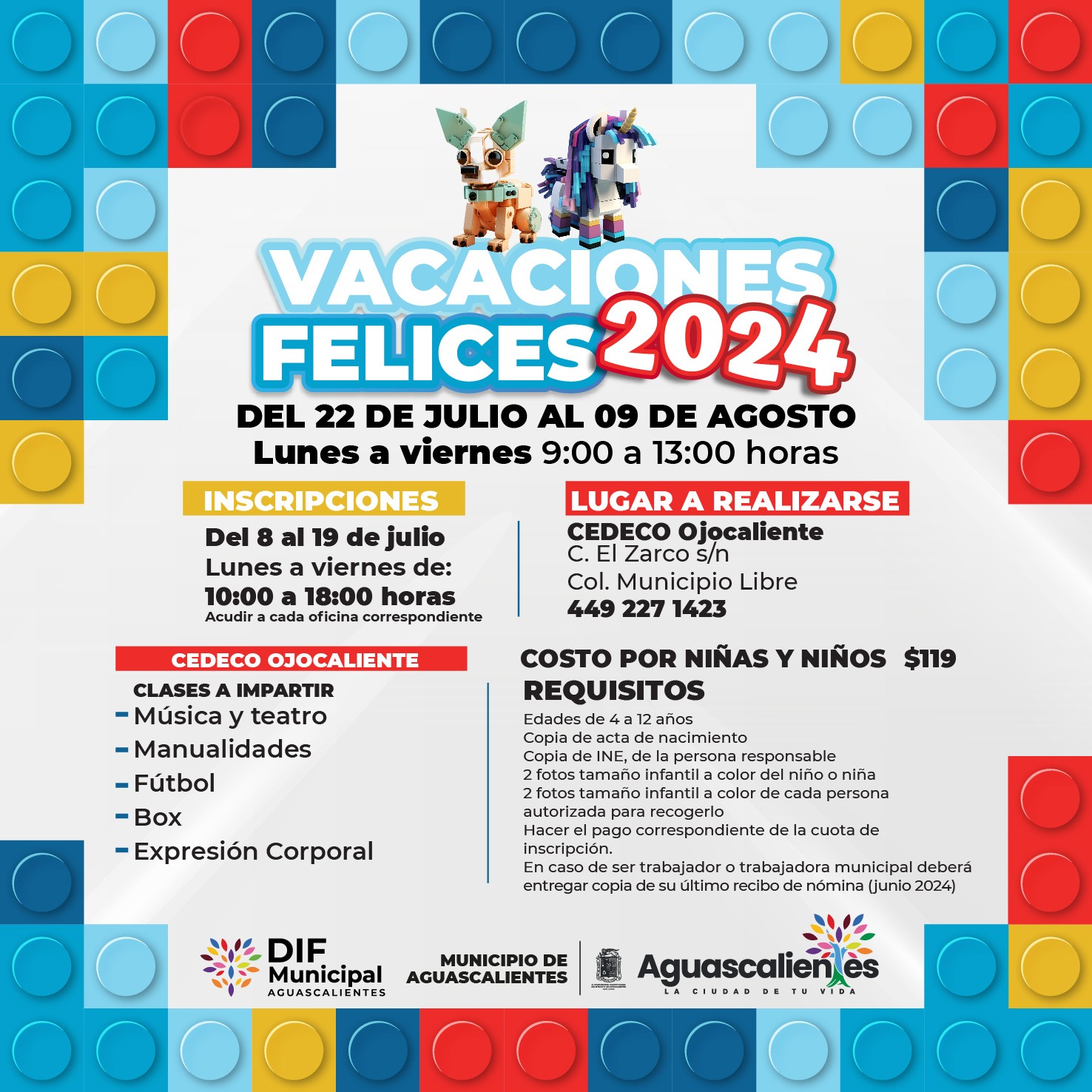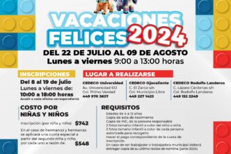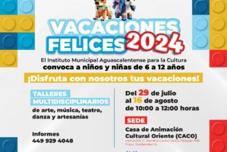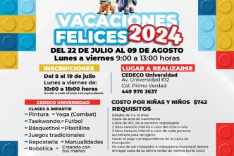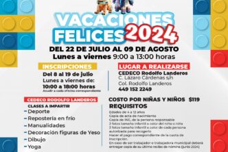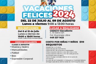 El DIF Municipal de Aguascalientes invita a los padres y madres de familia a inscribir a sus hijas e hijos, de 4 a 12 años de edad, al curso de verano Vacaciones Felices 2024 que se llevará a cabo en los Centros de Desarrollo Comunitario (Cedeco) Universidad, Ojocaliente y Rodolfo Landeros, del 22 de julio al 09 de agosto.