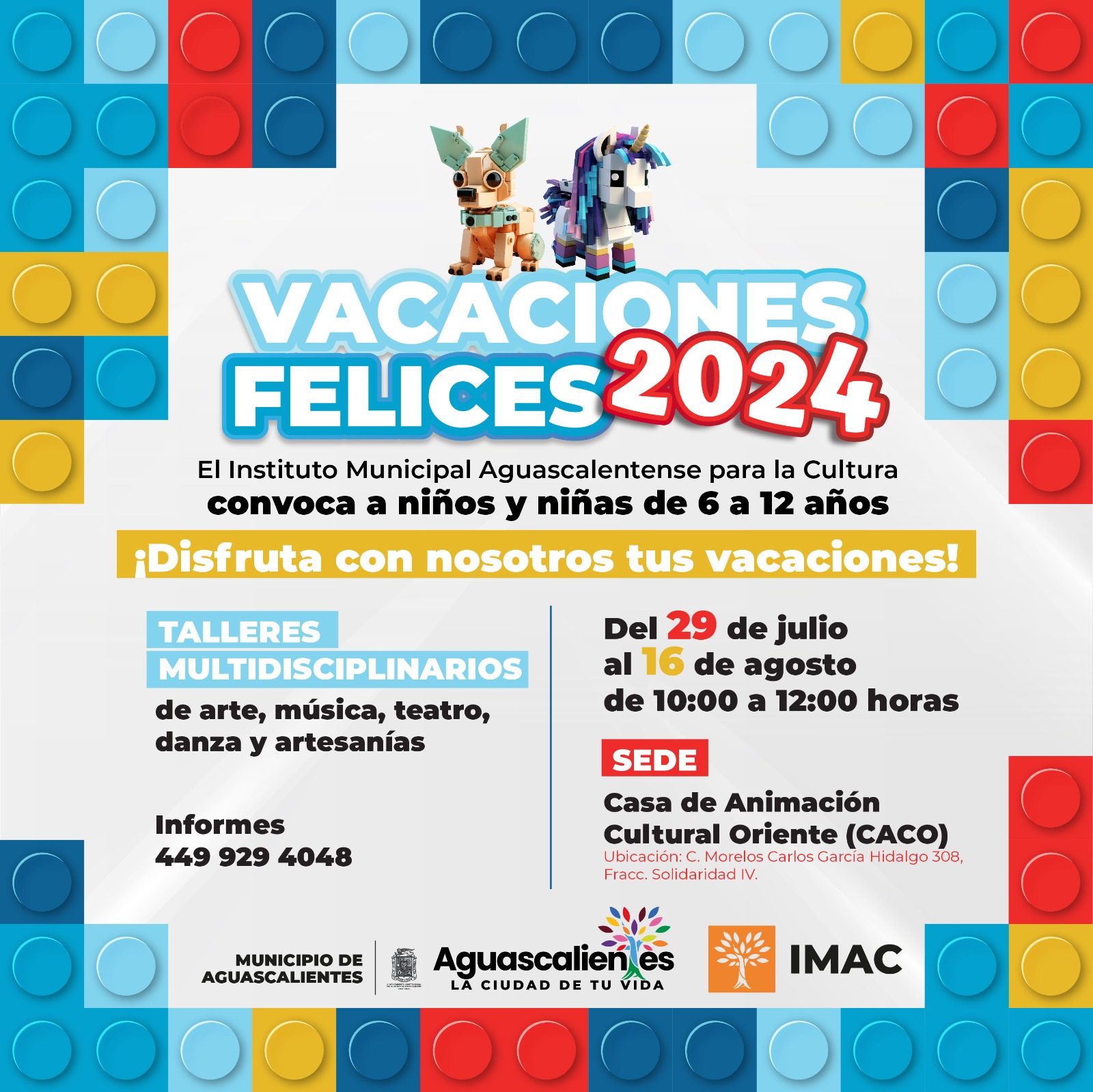 De igual forma, el Instituto Municipal Aguascalentense para la Cultura (IMAC), invita a las niñas y niños de 6 a 12 años a participar en los cursos de verano que tendrán como sede la Casa de Animación Cultural Oriente (CACO), ubicada en la calle Morelos Carlos García Hidalgo No. 308, en el fraccionamiento Solidaridad IV.