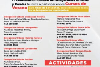 La Coordinación General de Delegaciones Urbanas y Rurales también dio a conocer que durante los meses de julio y agosto se realizarán los tradicionales cursos de verano en las diferentes delegaciones municipales, con el objetivo de que los niños y niñas de 6 a 12 años puedan incursionar en diferentes actividades.