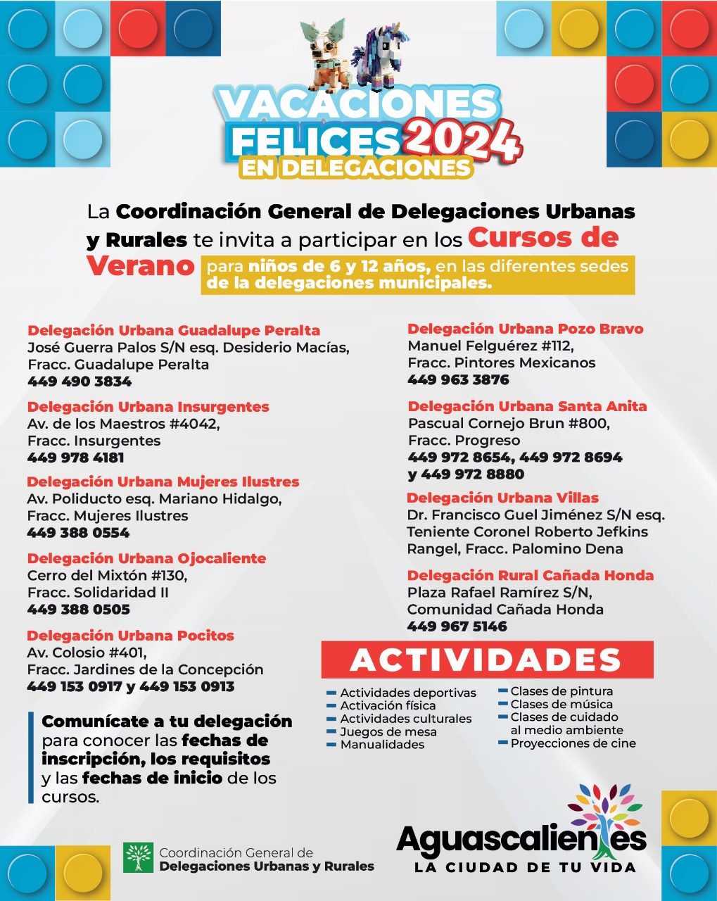 En este año serán 9 delegaciones las que impartirán cursos de verano: Cañada Honda, Guadalupe Peralta, Insurgentes, Mujeres Ilustres, Ojocaliente, Pocitos, Pozo Bravo, Santa Anita y Villas, por lo que es indispensable que los interesados se comuniquen a su delegación para conocer las fechas de inscripción, los requisitos y las fechas de inicio de los cursos.