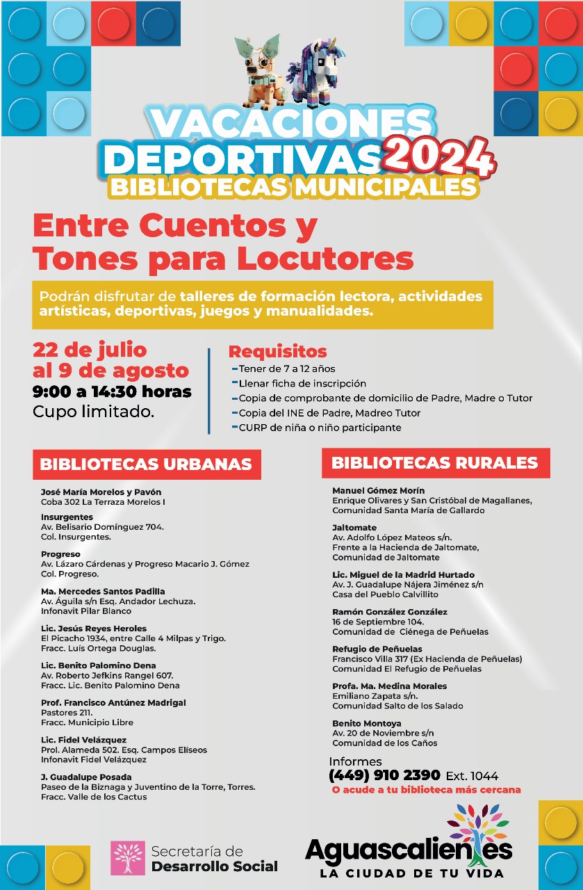 La Dirección de Educación de la Secretaría de Desarrollo Social del Municipio de Aguascalientes está lista para ofrecer alrededor de mil niñas y niños el curso de verano 2024 “Entre Cuentos y Tones para Locutores”, que se llevará a cabo en las 16 Bibliotecas Municipales del área urbana y rural.