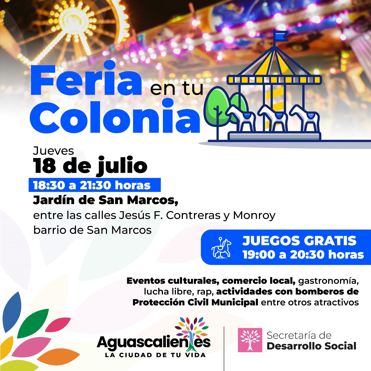 Con el propósito de impulsar la convivencia familiar y vecinal, así como la práctica deportiva, el Municipio de Aguascalientes, a través de la Secretaría de Desarrollo Social invita a la población a asistir al programa “Feria en tu Colonia”, que en esta ocasión se realizará en el Jardín de San Marcos, ubicado entre las calles Jesús F. Contreras y Monroy, en el barrio del mismo nombre, el próximo 18 de julio, a partir de las 18:30 horas.