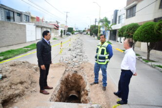 Finalmente, Leo Montañez visitó Av. Aguascalientes oriente en su cruce con Av. Pensadores Mexicanos, donde se dará inicio con los trabajos de construcción de tres caimanes que permitirán captar el agua pluvial y evitar así, inundaciones en esta avenida con alto flujo vehicular.