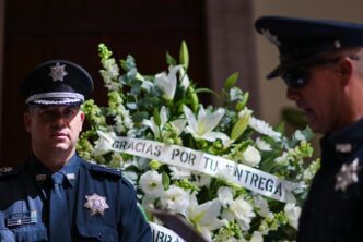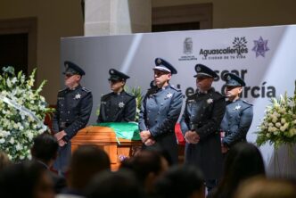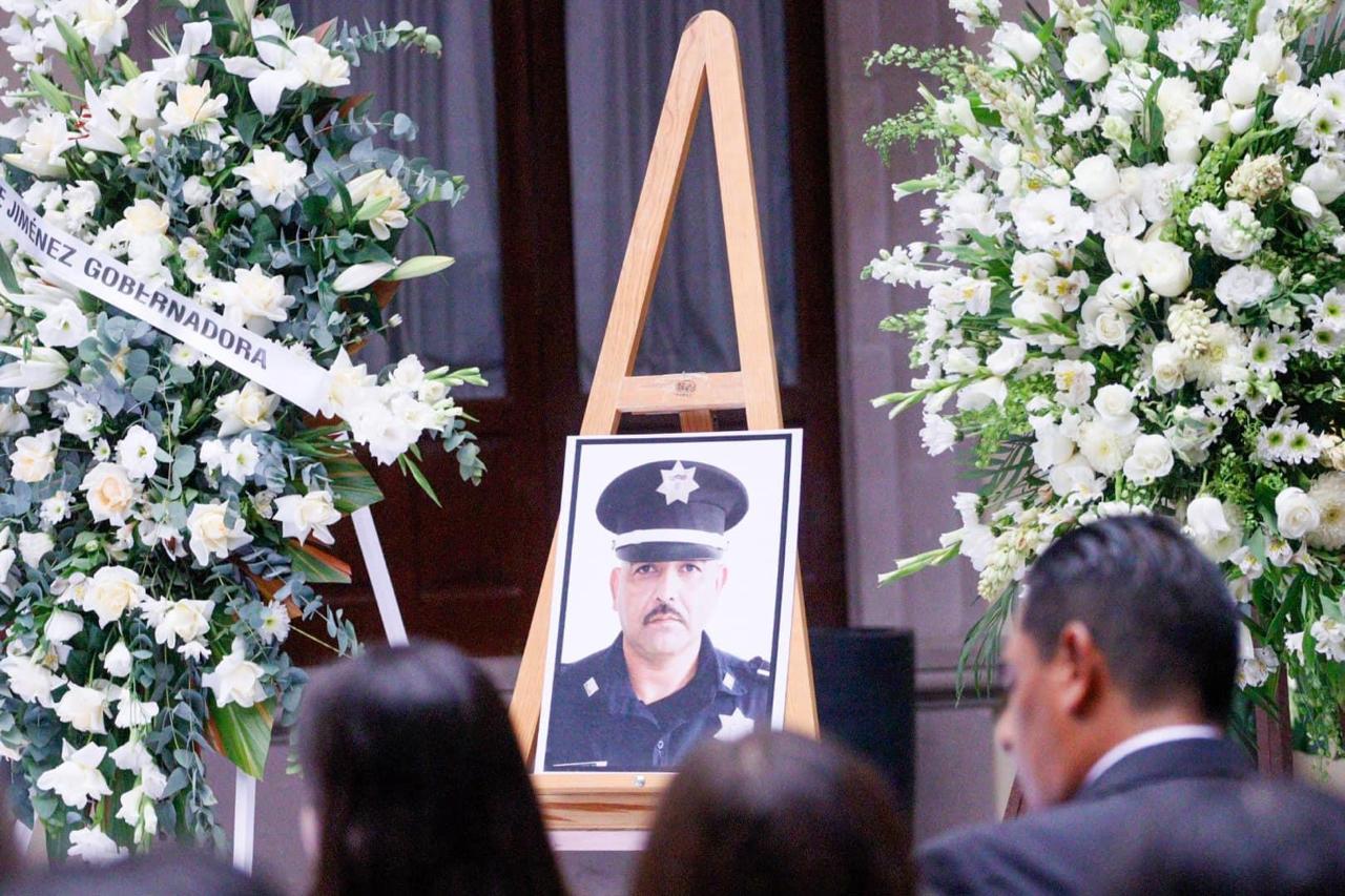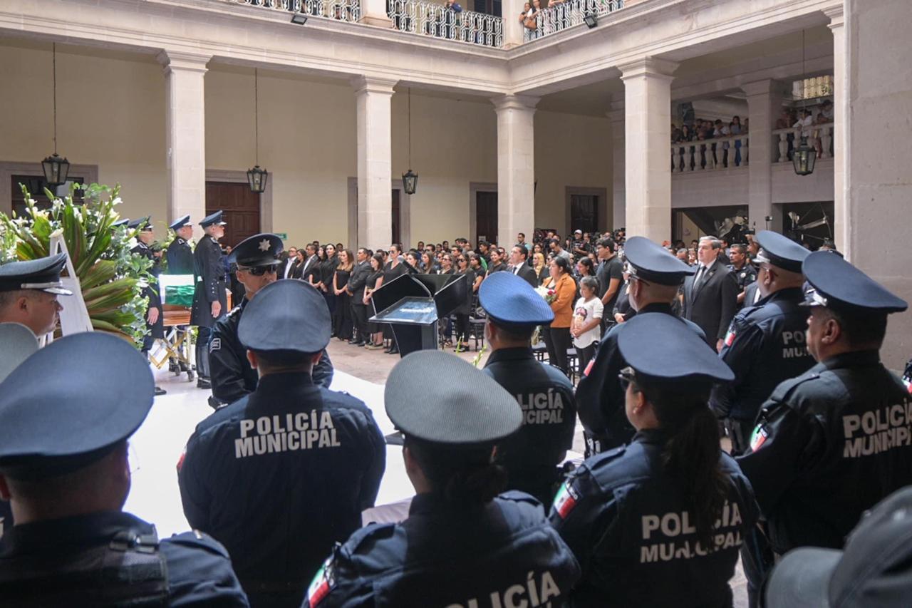 Finalmente, el presidente municipal Leo Montañez, acompañado por la viuda del policía, del secretario de Seguridad Pública Estatal, Manuel Alonso, el secretario general de Gobierno, Florentino de Jesús Reyes Berlie y del titular de la corporación municipal, hicieron la primera guardia del féretro, antes de despedirlo del recinto municipal.