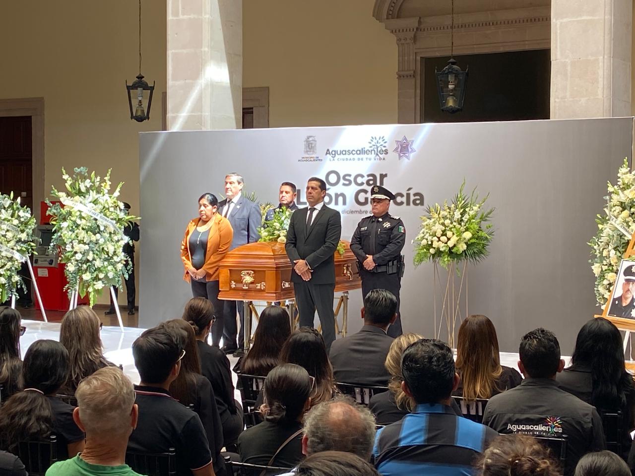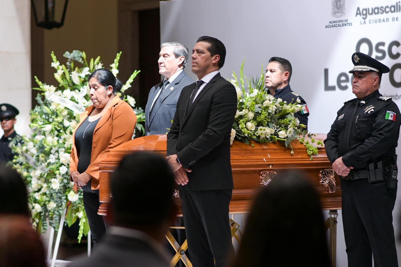 En el Segundo Patio de Palacio Municipal, el presidente municipal de Aguascalientes, Leo Montañez, encabezó el homenaje al policía preventivo Óscar León García, quien perdiera la vida el pasado viernes al caer a un socavón en la colonia Ojo de Agua.