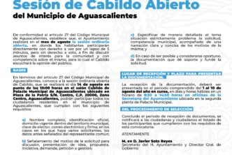 La Secretaría del H. Ayuntamiento y la Dirección General de Gobierno del Municipio de Aguascalientes invita a participar en la Sesión Ordinaria Abierta del Cabildo correspondiente al mes de agosto de 2024, con el fin de promover la participación ciudadana en los asuntos de interés público.