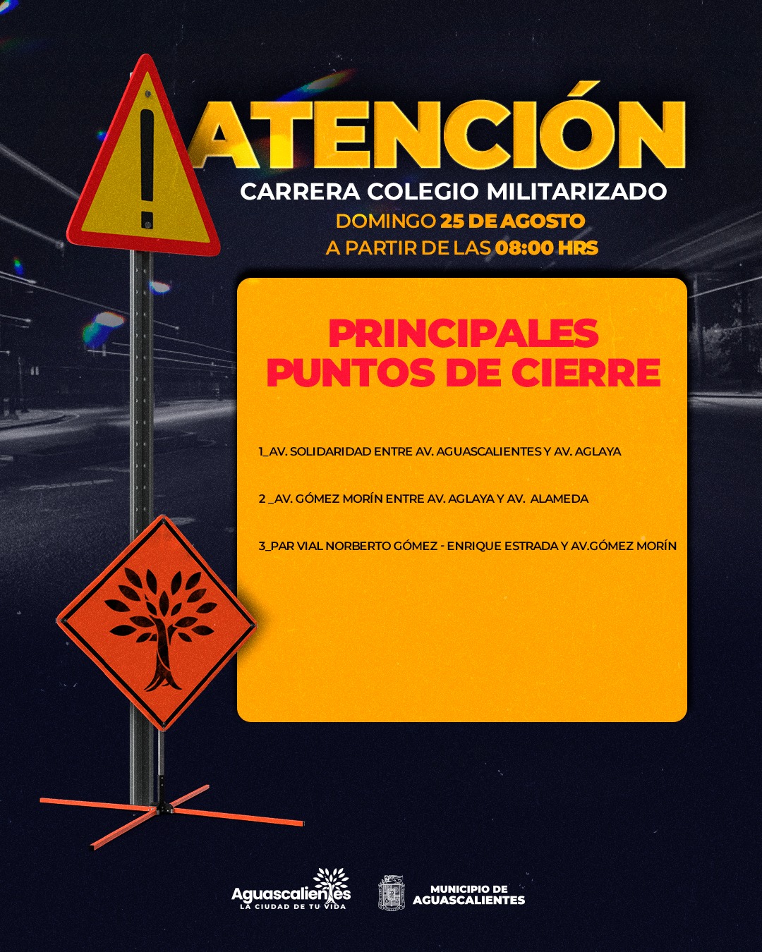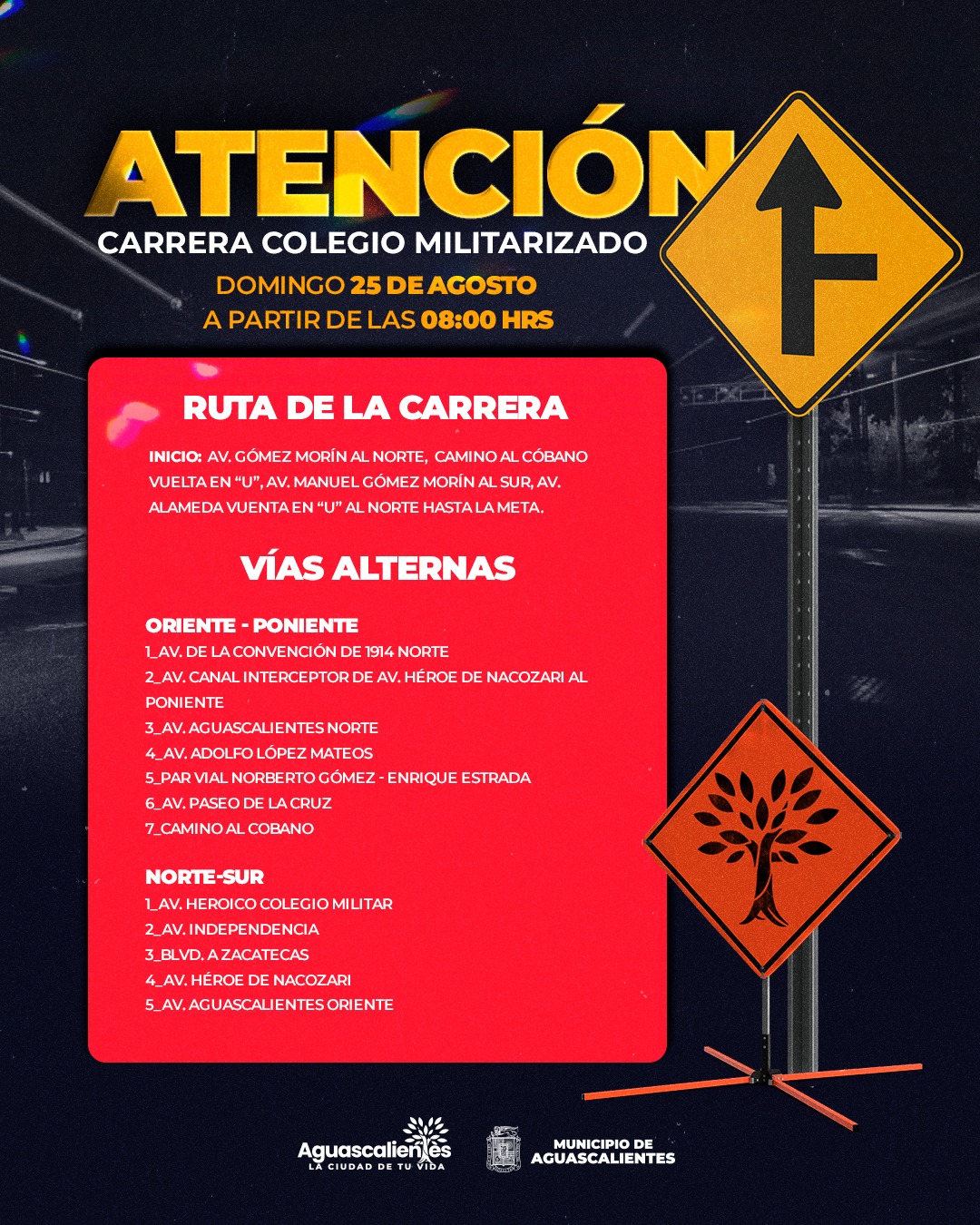 La Secretaría de Seguridad Pública Municipal de Aguascalientes (SSPM), a través de la Dirección de Movilidad, prepara el operativo con motivo de la «Carrera Colegio Militarizado», que tendrá lugar el próximo domingo 25 de agosto, a las 08:00 horas del día.