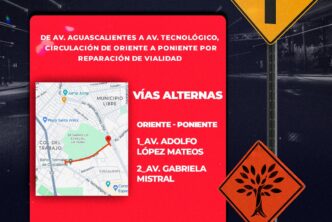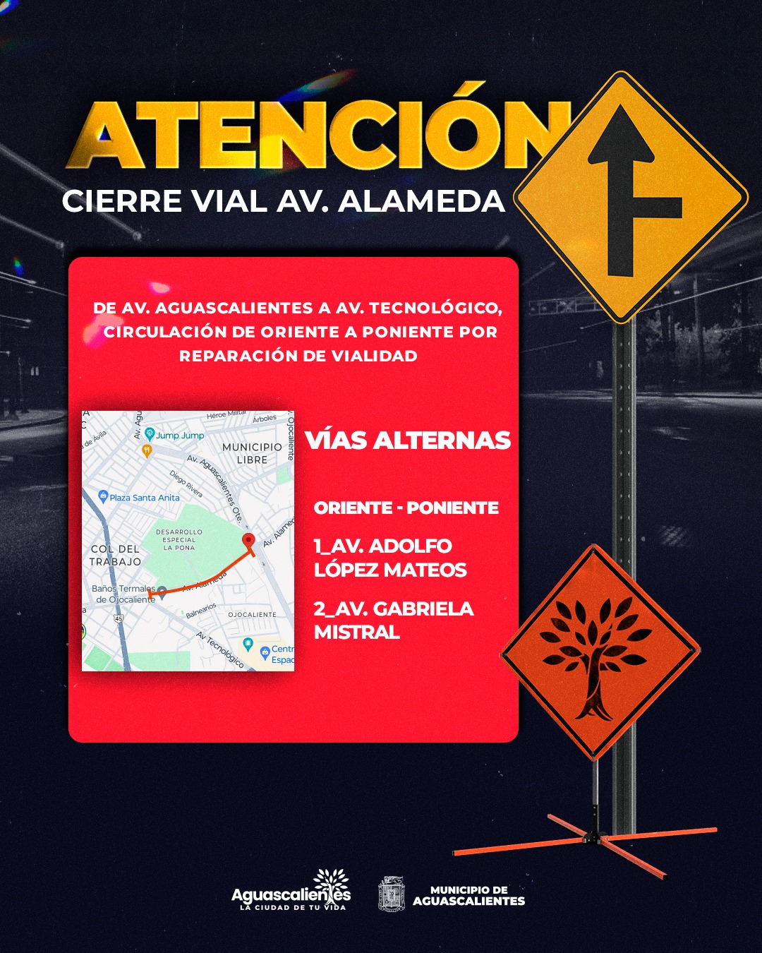 El Municipio de Aguascalientes da a conocer que a partir de este lunes 26 se efectuó el cierre a la circulación vehicular por reparación de vialidad en el sentido de oriente a poniente en avenida Alameda en el tramo de avenida Aguascalientes a avenida Tecnológico.