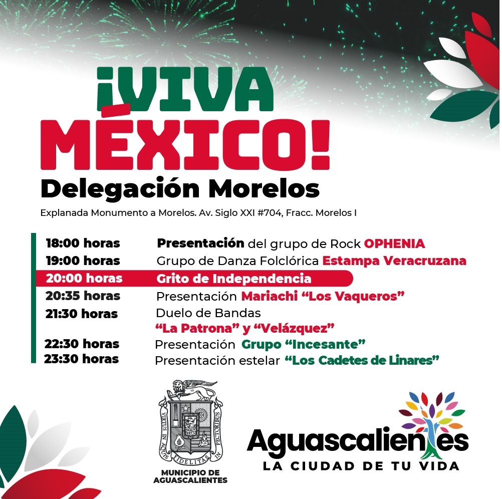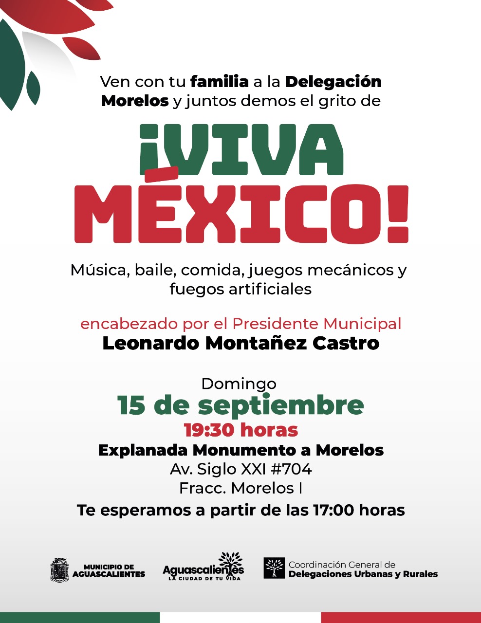 El Municipio de Aguascalientes invita a las familias de Aguascalientes a celebrar el tradicional «Grito de Independencia» en la Delegación Morelos con una fiesta donde habrá música en vivo, antojitos mexicanos, juegos mecánicos y fuegos artificiales.